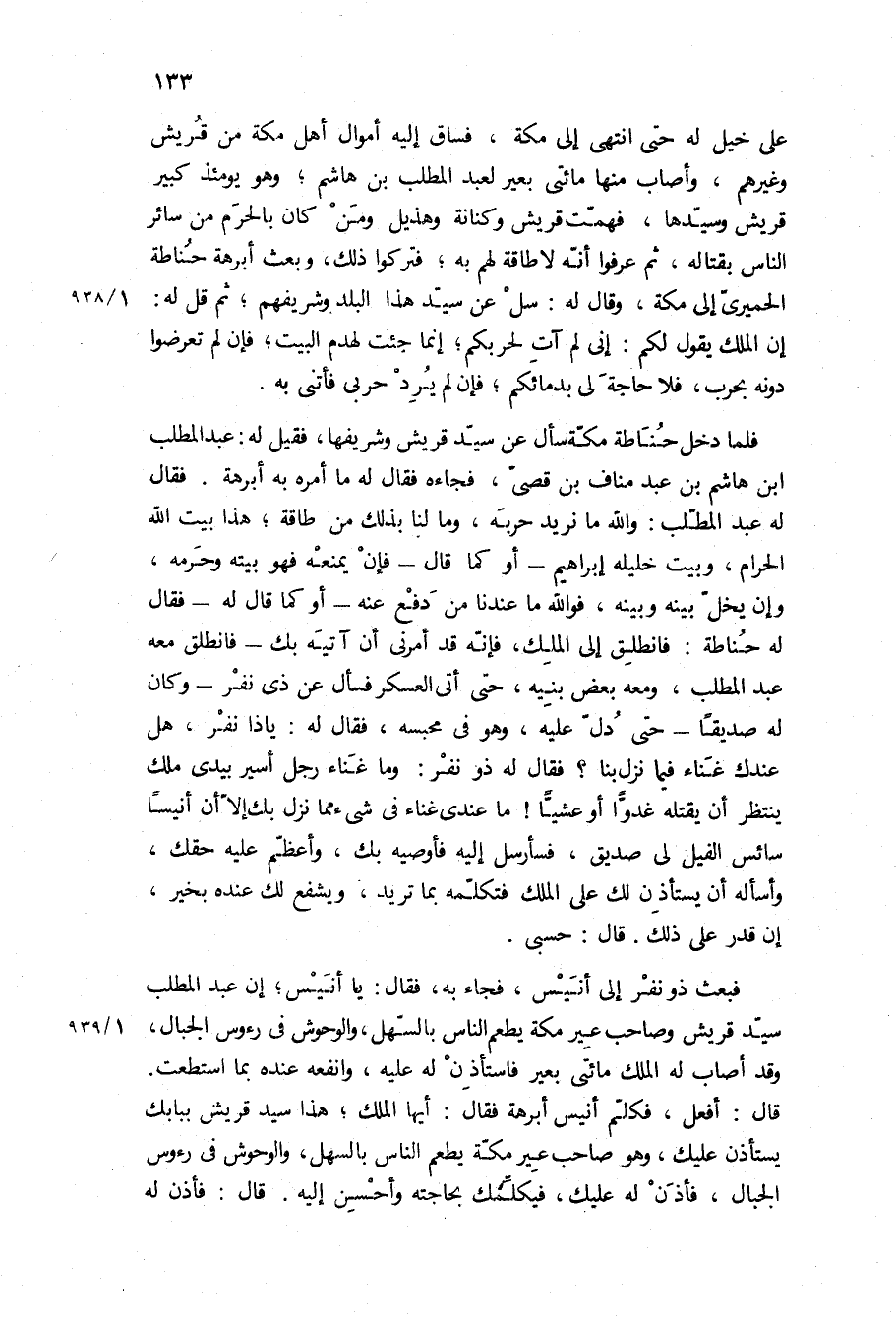 فلما دخل حناطة مكة سأل عن سيد قريش وشريفها، فقيل له: عبد المطلب ابن هاشم بن عبد مناف بن قصي، فجاءه فقال له ما أمره به أبرهة فقال له عبد المطلب: والله ما نريد حربه، وما لنا بذلك من طاقة، هذا بيت الله الحرام، وبيت خليله إبراهيم- أو كما قَالَ- فإن يمنعه فهو بيته وحرمه، وإن يخل بينه وبينه، فو الله ما عندنا من دفع عنه- أو كما قَالَ له- فقال له حناطة: فانطلق إلى الملك، فإنه قد أمرني أن آتيه بك- فانطلق معه عبد المطلب، ومعه بعض بنيه، حتى أتى العسكر فسأل عن ذي نفر- وكان له صديقا- حتى دل عليه، وهو في محبسه، فقال له: يا ذا نفر، هل عندك غناء فيما نزل بنا؟ فقال له ذو نفر: وما غناء رجل أسير بيدي ملك ينتظر أن يقتله غدوا أو عشيا! ما عندي غناء في شيء مما نزل بك إلا أن أنيسا سائس الفيل لي صديق، فسأرسل إليه فأوصيه بك، وأعظم عليه حقك، وأسأله أن يستأذن لك على الملك فتكلمه بما تريد، ويشفع لك عنده بخير، إن قدر على ذلك قَالَ: حسبي.