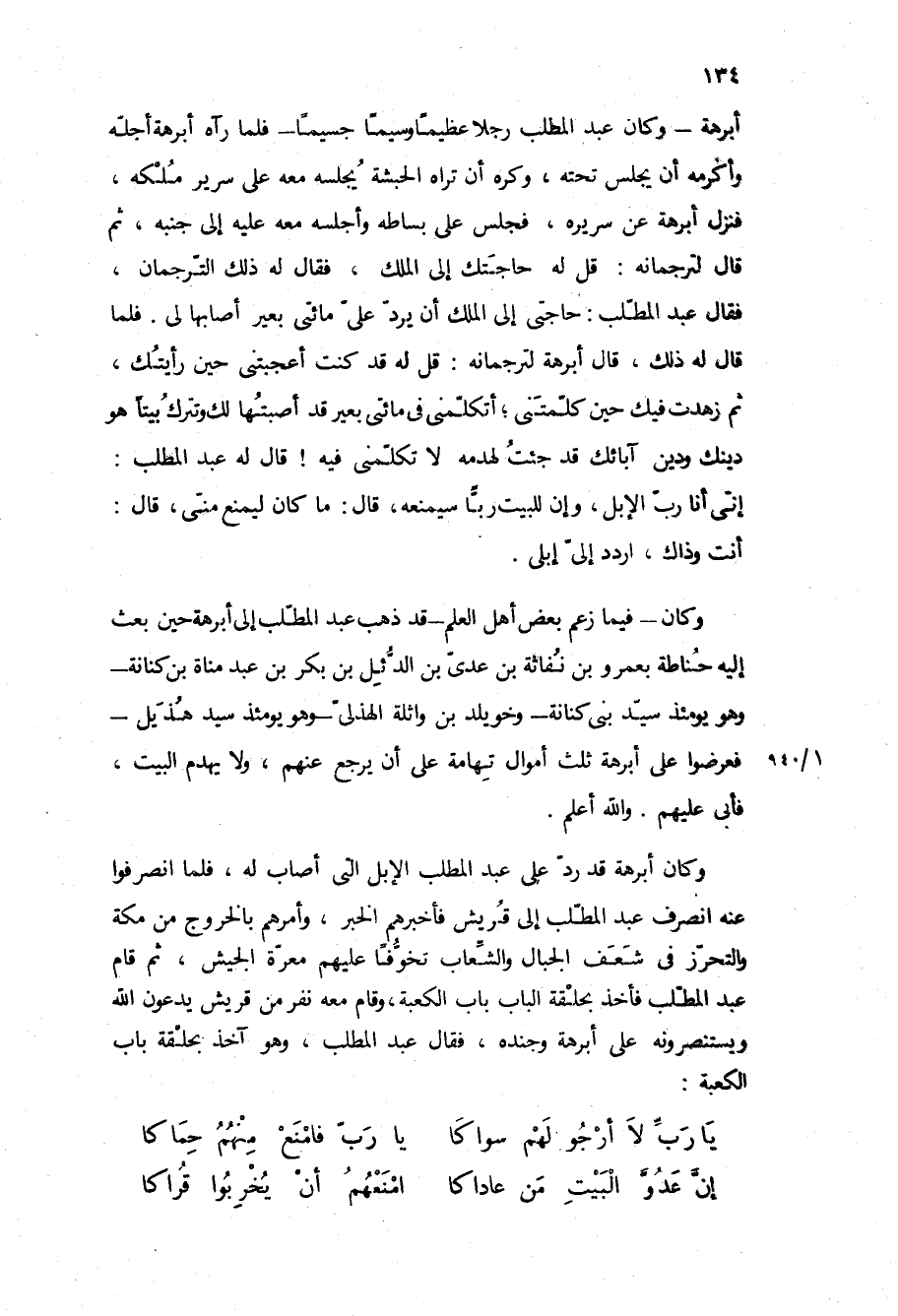 أبرهة- وكان عبد المطلب رجلا عظيما وسيما جسيما- فلما رآه أبرهة أجله وأكرمه أن يجلس تحته، وكره أن تراه الحبشة يجلسه معه على سرير ملكه، فنزل أبرهة عن سريره، فجلس على بساطه وأجلسه معه عليه إلى جنبه، ثم قَالَ لترجمانه: قل له حاجتك إلى الملك، فقال له ذلك الترجمان، فقال عبد المطلب: حاجتي إلى الملك أن يرد علي مائتي بعير أصابها لي فلما قَالَ له ذلك، قَالَ أبرهة لترجمانه: قل له قد كنت أعجبتني حين رأيتك، ثم زهدت فيك حين كلمتني، أتكلمني في مائتي بعير قد أصبتها لك وتترك بيتا هو دينك ودين آبائك قد جئت لهدمه لا تكلمني فيه! قال له عبد المطلب:
