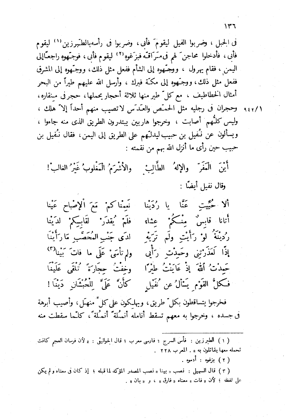 في الجبل، وضربوا الفيل ليقوم فأبى، وضربوا في رأسه بالطبرزين ليقوم فأبى، فأدخلوا محاجن لهم في مراقه فبزغوه ليقوم فأبى، فوجهوه راجعا إلى اليمن، فقام يهرول، ووجهوه إلى الشام ففعل مثل ذلك، ووجهوه إلى المشرق ففعل مثل ذلك، ووجهوه إلى مكة فبرك، وأرسل الله عليهم طيرا من البحر أمثال الخطاطيف، مع كل طير منها ثلاثة أحجار يحملها، حجر في منقاره، وحجران في رجليه مثل الحمص والعدس لا تصيب منهم أحدا إلا هلك، وليس كلهم أصابت، وخرجوا هاربين يبتدرون الطريق الذي منه جاءوا، ويسألون عن نفيل بن حبيب ليدلهم على الطريق إلى اليمن، فقال نفيل بن حبيب حين رأى ما أنزل الله بهم من نقمته: