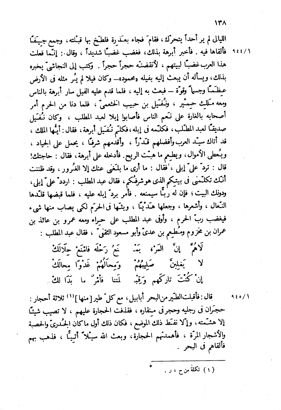 اللَّيَالِي لَمْ يَرَ أَحَدًا يَتَحَرَّكُ، فَقَامَ فَجَاءَ بِعَذِرَةٍ فَلَطَّخَ بِهَا قِبْلَتَهُ، وَجَمَعَ جِيَفًا فَأَلْقَاهَا فِيهِ فَأُخْبِرَ أَبْرَهَةُ بِذَلِكَ، فَغَضِبَ غَضَبًا شَدِيدًا، وَقَالَ: إِنَّمَا فَعَلَتْ هَذَا الْعَرَبُ غَضَبًا لِبَيْتِهِمْ، لَأَنْقُضَنَّهُ حَجَرًا حَجَرًا وَكَتَبَ إِلَى النَّجَاشِيِّ يُخْبِرُهُ بِذَلِكَ، وَيَسْأَلُهُ أَنْ يَبْعَثَ إِلَيْهِ بِفِيلِهِ مَحْمُودٍ- وَكَانَ فِيلًا لَمْ يُرَ مِثْلَهُ فِي الأَرْضِ عِظَمًا وَجِسْمًا وَقُوَّةً- فَبَعَثَ بِهِ إِلَيْهِ، فَلَمَّا قَدِمَ عَلَيْهِ الْفِيلُ سَارَ أَبْرَهَةُ بِالنَّاسِ وَمَعَهُ مَلِكُ حِمْيَرٍ، وَنُفَيْلُ بْنُ حَبِيبٍ الْخَثْعَمِيُّ، فَلَمَّا دَنَا مِنَ الْحَرَمِ أَمَرَ أَصْحَابَهُ بِالْغَارَةِ عَلَى نِعَمِ النَّاسِ فَأَصَابُوا إِبِلًا لِعَبْدِ الْمُطَّلِبِ، وَكَانَ نُفَيْلٌ صَدِيقًا لِعَبْدِ الْمُطَّلِبِ، فَكَلَّمَهُ فِي إِبِلِهِ، فَكَلَّمَ نُفَيْلٌ أَبْرَهَةَ، فَقَالَ: أَيُّهَا الْمَلِكُ، قَدْ أَتَاكَ سَيِّدُ الْعَرَبِ وَأَفْضَلُهُمْ قَدْرًا، وَأَقْدَمُهُمْ شَرَفًا، يَحْمِلُ عَلَى الْجِيَادِ، وَيُعْطِي الأَمْوَالَ، وَيُطْعِمُ مَا هَبَّتِ الرِّيحُ فَأَدْخَلَهُ عَلَى أَبْرَهَةَ، فَقَالَ: حَاجَتَكَ! قَالَ: تَرُدُّ عَلَيَّ إِبِلِي، فَقَالَ: مَا أَرَى مَا بَلَغَنِي عَنْكَ إِلَّا الْغُرُورُ، وَقَدْ ظَنَنْتُ أَنَّكَ تُكَلِّمُنِي فِي بَيْتِكُمُ الَّذِي هُوَ شَرَفُكُمْ، فَقَالَ عَبْدُ الْمُطَّلِبِ: ارْدُدْ عَلَيَّ إِبِلِي، وَدُونَكَ الْبَيْتَ، فَإِنَّ لَهُ رَبًّا سَيُمْنَعُهُ فَأَمَر بِرَدِّ إِبِلِهِ عَلَيْهِ، فَلَمَّا قَبَضَهَا قَلَّدَهَا النِّعَالَ، وَأَشْعَرَهَا، وَجَعَلَهَا هَدْيًا، وَبَثَّهَا فِي الْحَرَمِ لِكَيْ يُصَابَ مِنْهَا شَيْءٌ فَيَغْضَبُ رَبُّ الْحَرَمِ، وَأَوْفَى عَبْدُ المطلب على حراء وَمَعَهُ عَمْرُو بْنُ عَائِذِ بْنِ عِمْرَانَ بْنِ مَخْزُومٍ وَمُطْعِمُ بْنُ عَدِيٍّ وَأَبُو مَسْعُودٍ الثَّقَفِيُّ، فَقَالَ عَبْدُ الْمُطَّلِبِ: