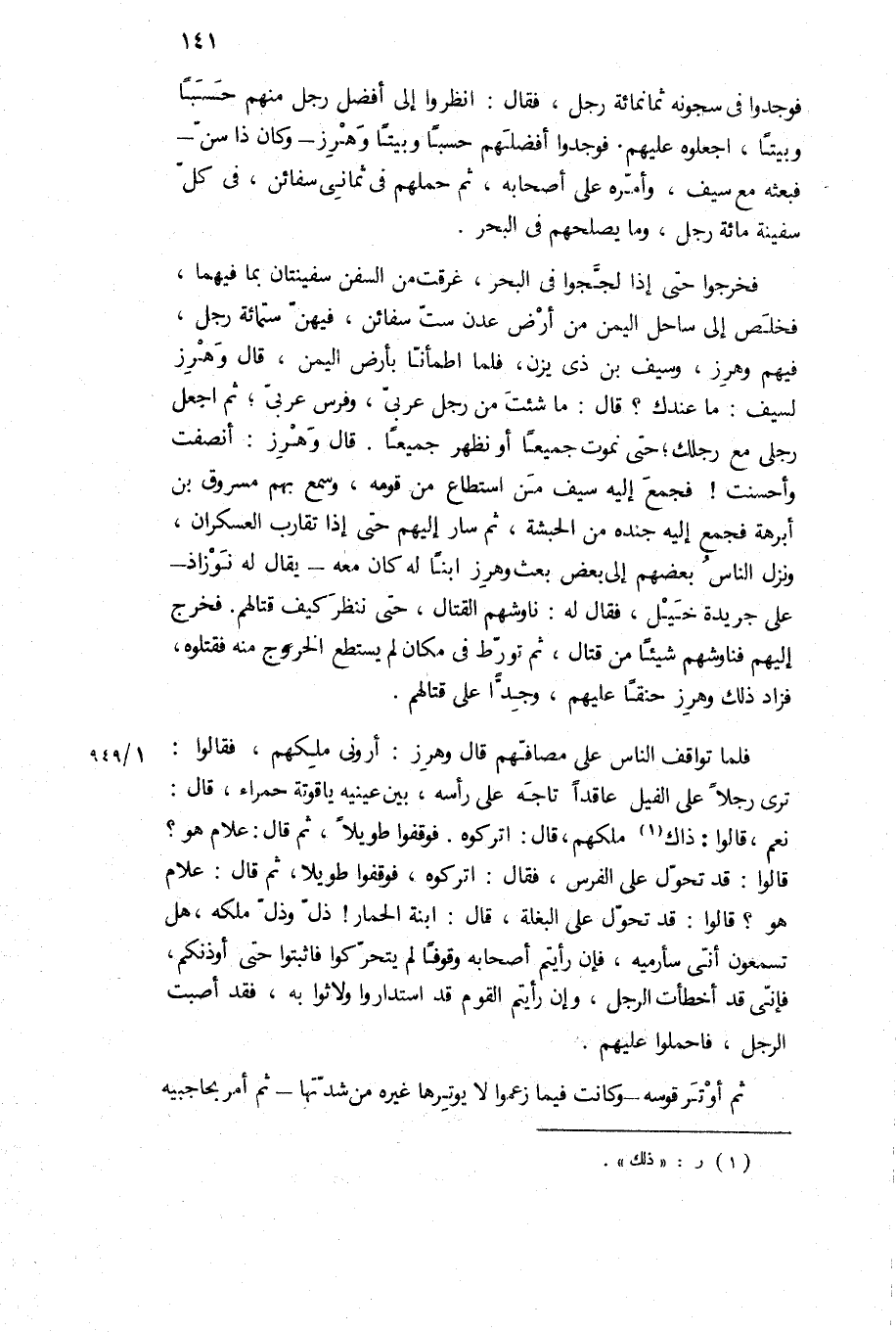 فوجدوا في سجونه ثمانمائه رجل، فقال: انظروا إلى أفضل رجل منهم حسبا وبيتا، اجعلوه عليهم فوجدوا أفضلهم حسبا وبيتا وهرز- وكان ذا سن- فبعثه مع سيف، وأمره على أصحابه، ثم حملهم في ثماني سفائن، في كل سفينة مائة رجل، وما يصلحهم في البحر فخرجوا حتى إذا لججوا في البحر، غرقت من السفن سفينتان بما فيهما، فخلص إلى ساحل اليمن من ارض عدن ست سفائن، فيهن ستمائه رجل، فيهم وهرز، وسيف بن ذي يزن، فلما اطمأنا بأرض اليمن، قَالَ وهرز لسيف: ما عندك؟ قَالَ: ما شئت من رجل عربي، وفرس عربي، ثم اجعل رجلي مع رجلك، حتى نموت جميعا أو نظهر جميعا قَالَ وهرز: أنصفت وأحسنت! فجمع إليه سيف من استطاع من قومه، وسمع بهم مسروق بن أبرهة فجمع إليه جنده من الحبشة، ثم سار إليهم حتى إذا تقارب العسكران، ونزل الناس بعضهم إلى بعض بعث وهرز ابنا له كان معه- يقال له نوزاذ- على جريدة خيل، فقال له: ناوشهم القتال، حتى ننظر كيف قتالهم فخرج إليهم فناوشهم شيئا من قتال، ثم تورط في مكان لم يستطع الخروج منه فقتلوه، فزاد ذلك وهرز حنقا عليهم، وجدا على قتالهم.