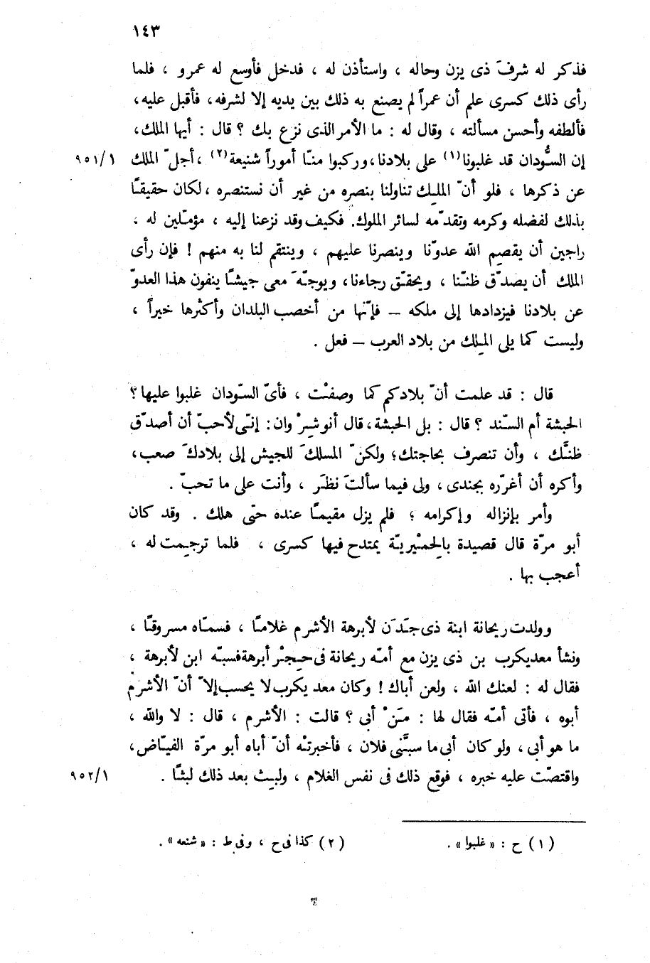 الحبشة أم السند؟ قَالَ: بل الحبشة، قَالَ أنوشروان: إني لأحب أن أصدق ظنك، وأن تنصرف بحاجتك، ولكن المسلك للجيش إلى بلادك صعب، وأكره أن أغرره بجندي، ولي فيما سألت نظر، وأنت على ما تحب.