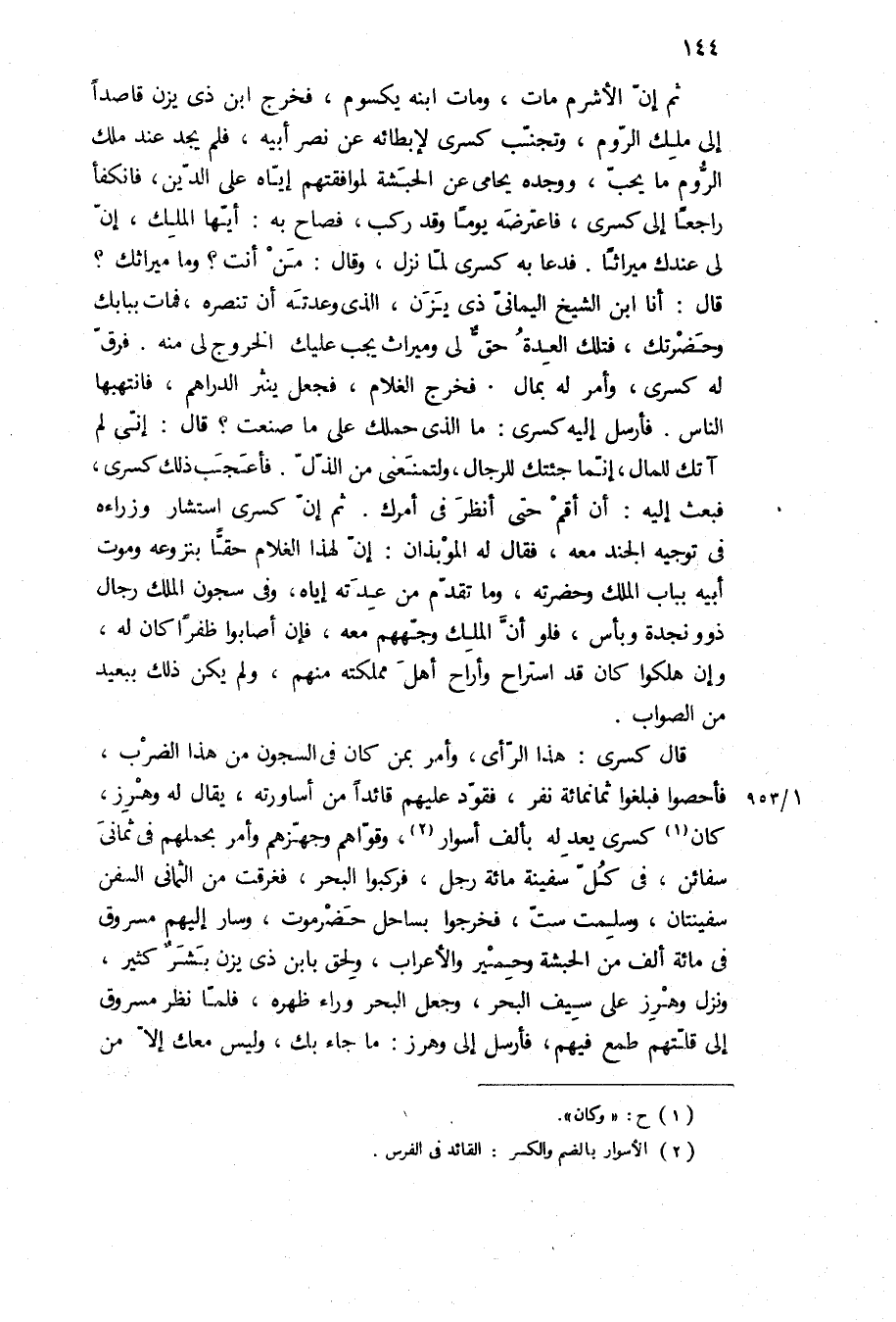 قَالَ كسرى: هذا الرأي، وأمر بمن كان في السجون من هذا الضرب فأحصوا فبلغوا ثمانمائه نفر، فقود عليهم قائدا من أساورته، يقال له وهرز، كان كسرى يعدله بألف أسوار، وقواهم وجهزهم وامر بحملهم في ثمانية سفائن، في كل سفينة مائة رجل، فركبوا البحر، فغرقت من الثماني السفن سفينتان، وسلمت ست، فخرجوا بساحل حضرموت، وسار إليهم مسروق في مائة ألف من الحبشة وحمير والأعراب، ولحق بابن ذي يزن بشر كثير، ونزل وهرز على سيف البحر، وجعل البحر وراء ظهره، فلما نظر مسروق إلى قلتهم طمع فيهم، فأرسل إلى وهرز: ما جاء بك، وليس معك إلا من