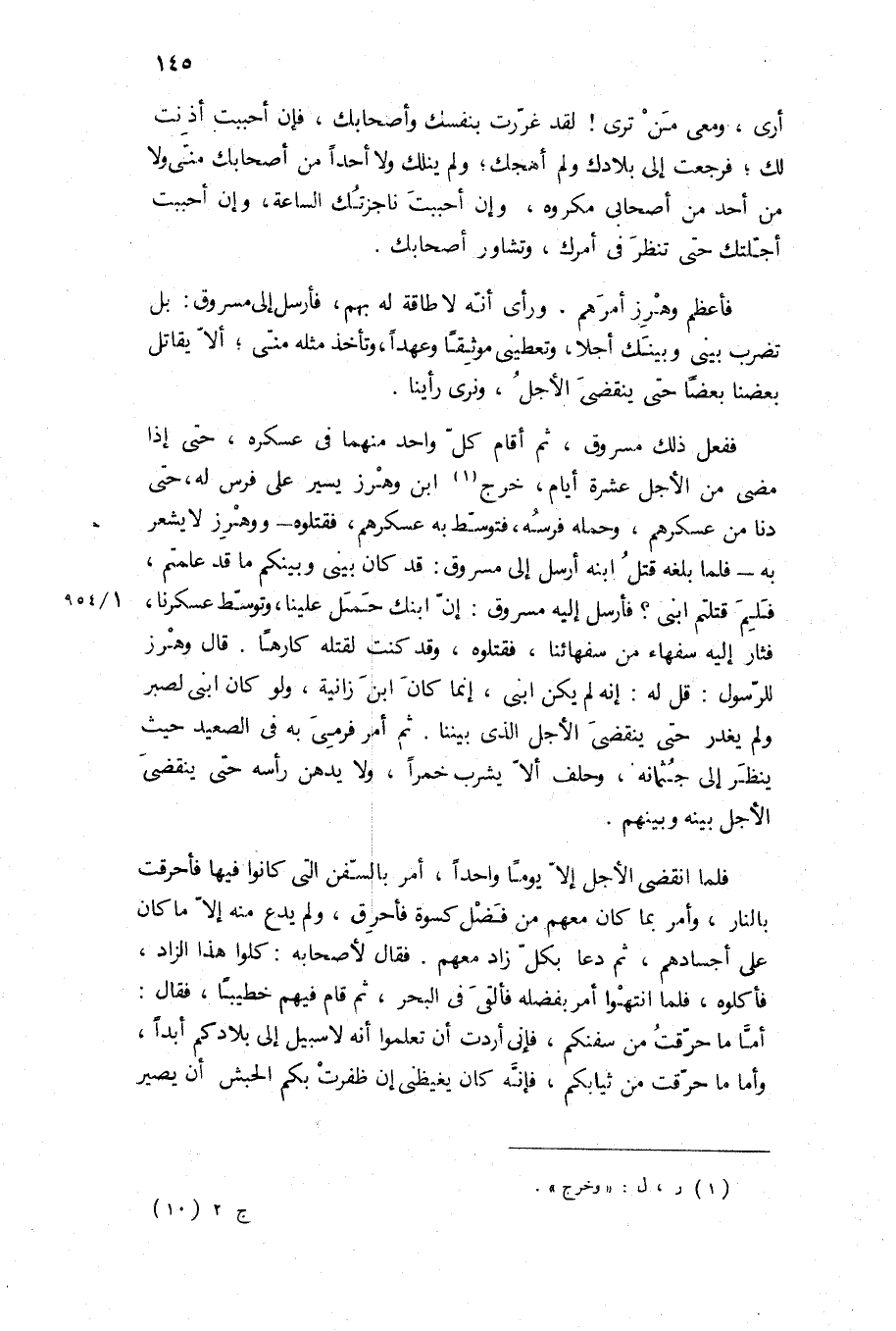 ففعل ذلك مسروق، ثم أقام كل واحد منهما في عسكره، حتى إذا مضى من الأجل عشرة أيام، خرج ابن وهرز يسير على فرس له، حتى دنا من عسكرهم، وحمله فرسه، فتوسط به عسكرهم، فقتلوه- ووهرز لا يشعر به- فلما بلغه قتل ابنه أرسل إلى مسروق: قد كان بيني وبينكم ما قد علمتم، فلم قتلتم ابني؟ فأرسل إليه مسروق: إن ابنك حمل علينا، وتوسط عسكرنا، فثار إليه سفهاء من سفهائنا، فقتلوه، وقد كنت لقتله كارها قَالَ وهرز للرسول: قل له: إنه لم يكن ابني، إنما كان ابن زانية، ولو كان ابني لصبر ولم يغدر حتى ينقضي الأجل الذي بيننا ثم أمر فرمي به في الصعيد حيث ينظر إلى جثمانه، وحلف ألا يشرب خمرا، ولا يدهن رأسه حتى ينقضي الأجل بينه وبينهم.