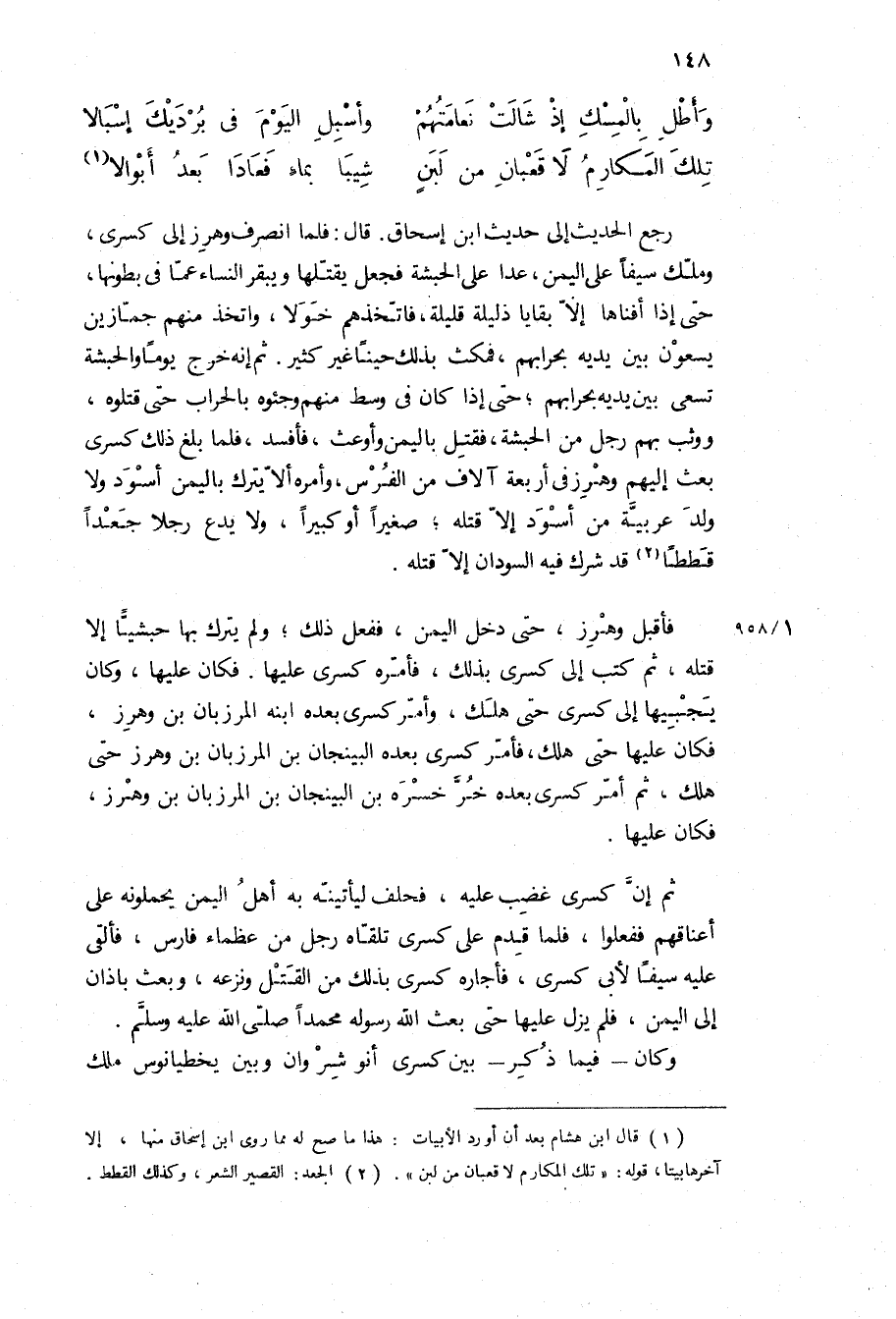 رجع الحديث إلى حديث ابن إسحاق قال: فلما انصرف وهرز إلى كسرى، وملك سيفا على اليمن، عدا على الحبشة فجعل يقتلها ويبقر النساء عما في بطونها، حتى إذا أفناها إلا بقايا ذليلة قليلة، فاتخذهم خولا، واتخذ منهم جمازين يسعون بين يديه بحرابهم، فمكث بذلك حينا غير كثير ثم إنه خرج يوما والحبشة تسعى بين يديه بحرابهم، حتى إذا كان في وسط منهم وجئوه بالحراب حتى قتلوه، ووثب بهم رجل من الحبشة، فقتل باليمن وأوعث، فأفسد، فلما بلغ ذلك كسرى بعث إليهم وهرز في أربعة آلاف من الفرس، وأمره ألا يترك باليمن أسود ولا ولد عربية من أسود إلا قتله، صغيرا أو كبيرا، ولا يدع رجلا جعدا قططا قد شرك فيه السودان إلا قتله.