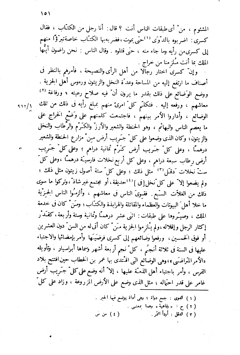 وإن كسرى اختار رجالا من أهل الرأي والنصيحة، فأمرهم بالنظر في أصناف ما ارتفع إليه من المساحة وعدة النخل والزيتون ورءوس أهل الجزية ووضع الوضائع على ذلك بقدر ما يرون ان فيه صلاح رعيته، ورفاعة معاشهم، ورفعه إليه فتكلم كل امرئ منهم بمبلغ رأيه في ذلك من تلك الوضائع، وأداروا الأمر بينهم، فاجتمعت كلمتهم على وضع الحراج على ما يعصم الناس والبهائم، وهو الحنطة والشعير والأرز والكرم والرطاب والنخل والزيتون، وكان الذي وضعوا على كل جريب أرض من مزارع الحنطة والشعير درهما، وعلى كل جريب أرض كرم ثمانية دراهم، وعلى كل جريب أرض رطاب سبعة دراهم، وعلى كل أربع نخلات فارسية درهما، وعلى كل ست نخلات دقل مثل ذلك، وعلى كل ستة أصول زيتون مثل ذلك، ولم يضعوا إلا على كل نخل في حديقة، أو مجتمع غير شاذ، وتركوا ما سوى ذلك من الغلات السبع فقوي الناس في معاشهم، وألزموا الناس الجزية ما خلا أهل البيوتات والعظماء والمقاتلة والهرابذة والكتاب، ومن كان في خدمة الملك، وصيروها على طبقات: اثني عشر درهما وثمانية وستة وأربعة، كقدر إكثار الرجل وإقلاله، ولم يلزموا الجزية من كان أتى له من السن دون العشرين أو فوق الخمسين، ورفعوا وضائعهم إلى كسرى فرضيها وأمر بإمضائها والاجتباء عليها في السنة في ثلاثة أنجم، كل نجم أربعة أشهر وسماها أبراسيار، وتأويله الأمر المتراضى، وهي الوضائع التي اقتدى بها عمر بن الخطاب حين افتتح بلاد الفرس، وأمر باجتباء أهل الذمة عليها، إلا أنه وضع على كل جريب أرض غامر على قدر احتماله، مثل الذي وضع على الأرض المزروعة، وزاد على كل