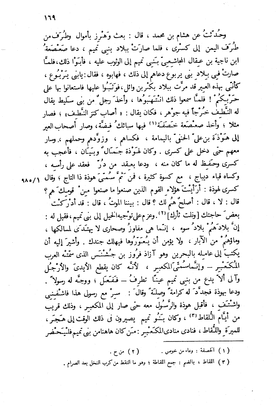 وَحُدِّثْتُ عَنْ هِشَامِ بْنِ مُحَمَّدٍ، قَالَ: بَعَثَ وَهْرَزٌ بِأَمْوَالٍ وَطرفٍ مِنْ طرفِ الْيَمَنِ إِلَى كِسْرَى، فَلَمَّا صَارَتْ بِبِلادِ بَنِي تَمِيمٍ، دَعَا صعصعة ابن نَاجِيَةَ بْنِ عِقَالٍ الْمُجَاشِعِيُّ بَنِي تَمِيمٍ إِلَى الْوُثُوبِ عَلَيْهِ، فَأَبَوْا ذَلِكَ، فَلَمَّا صَارَتْ فِي بِلادِ بَنِي يَرْبُوعٍ دَعَاهُمْ إِلَى ذَلِكَ، فَهَابُوهُ، فَقَالَ: يَا بَنِي يَرْبُوعٍ، كَأَنِّي بِهَذِهِ الْعِيرِ قَدْ مَرَّتْ بِبِلادِ بَكْرِ بْنِ وَائِلٍ، فَوَثَبُوا عَلَيْهَا فَاسْتَعَانُوا بِهَا عَلَى حَرْبِكُمْ! فَلَمَّا سَمِعُوا ذَلِكَ انْتَهَبُوهَا، وَأَخَذَ رَجُلٌ مِنْ بَنِي سَلِيطٍ يُقَالُ لَهُ النَّطِفُ خَرَجَا فِيهِ جَوْهَرُ، فَكَانَ يُقَالُ: أَصَابَ كَنْزَ النَّطِفِ، فَصَارَ مَثَلًا، وَأَخَذَ صَعْصَعَةُ خَصَفَةً فِيهَا سَبَائِكُ فِضَّةٍ، وَصَارَ أَصْحَابُ الْعِيرِ إِلَى هَوْذَةَ بْنِ عَلِيٍّ الْحَنَفِيِّ بِالْيَمَامَةِ، فَكَسَاهُمْ، وَزَوَّدَهُمْ وَحَمَلَهُمْ، وَسَارَ مَعَهُمْ حَتَّى دَخَل عَلَى كِسْرَى وَكَانَ لِهَوْذَةَ جَمَالٌ وَبَيَانٌ، فَأُعْجِبَ بِهِ كِسْرَى وَحَفِظَ لَهُ مَا كَانَ مِنْهُ، وَدَعَا بِعِقْدٍ مِنْ دُرٍّ فَعَقَدَ عَلَى رَأْسِهِ، وَكَسَاهُ قَبَاءَ دِيبَاجٍ، مَعَ كِسْوَةٍ كَثِيرَةٍ، فَمِنْ ثَمَّ سُمِّيَ هَوْذَةُ ذَا التَّاجِ، وَقَالَ كِسْرَى لِهَوْذَةَ: أَرَأَيْتَ هَؤُلَاءِ الْقَوْمَ الَّذِينَ صَنَعُوا مَا صَنَعُوا مِنْ قَوْمِكَ هُمْ؟