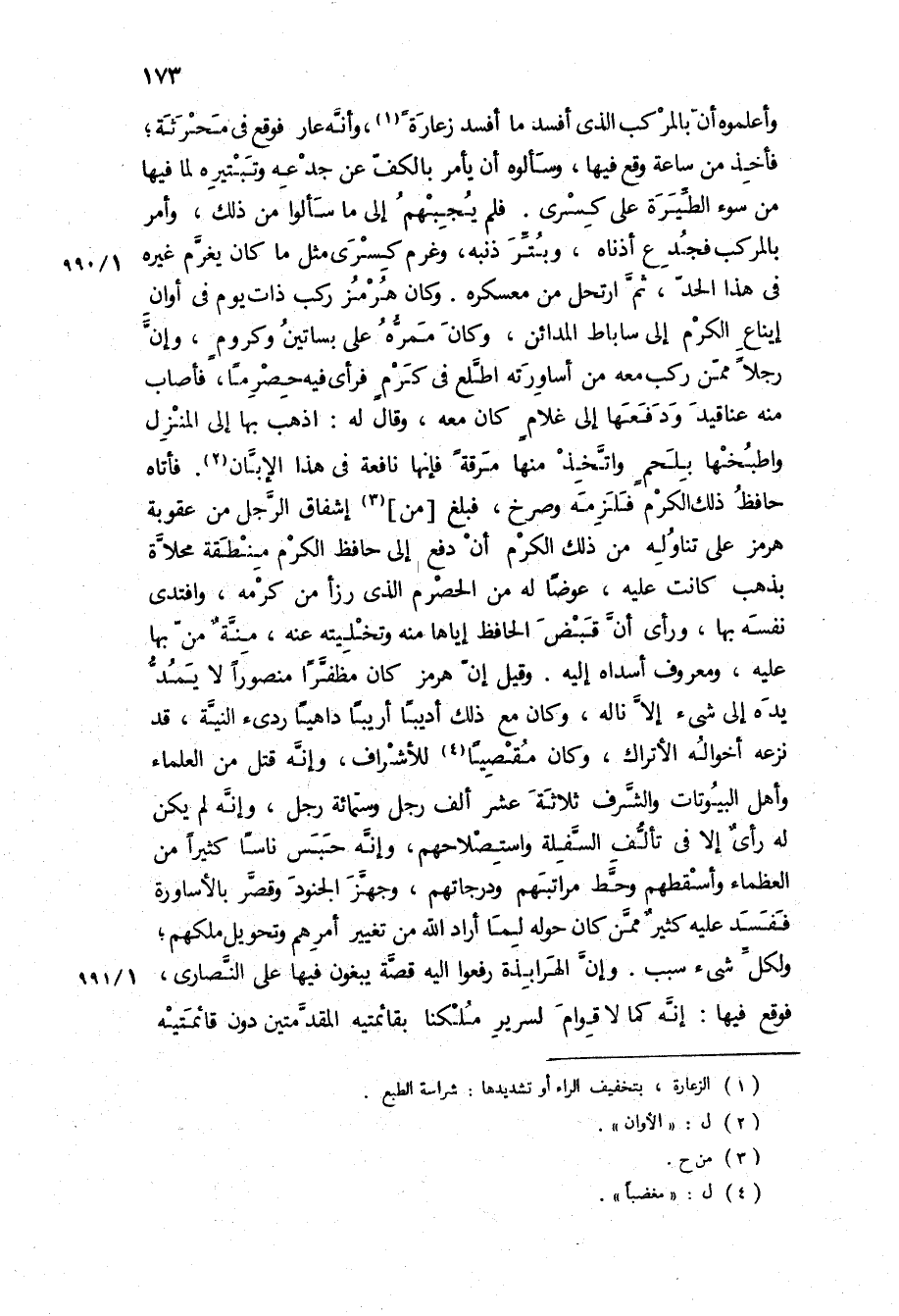 وأعلموه أن بالمركب الذي أفسد ما أفسد زعارة، وأنه عار فوقع في محرثة، فأخذ من ساعة وقع فيها، وسألوه أن يأمر بالكف عن جدعه وتبتيره لما فيها من سوء الطيرة على كسرى فلم يجبهم إلى ما سألوا من ذلك، وامر بالمركب فجدع أذناه، وبتر ذنبه، وغرم كسرى مثل ما كان يغرم غيره في هذا الحد، ثم ارتحل من معسكره وكان هرمز ركب ذات يوم في أوان إيناع الكرم إلى ساباط المدائن، وكان ممره على بساتين وكروم، وإن رجلا ممن ركب معه من أساورته اطلع في كرم فراى فيه حصرما، فأصاب منه عناقيد ودفعها إلى غلام كان معه، وقال له: اذهب بها إلى المنزل واطبخها بلحم واتخذ منها مرقة فإنها نافعة في هذا الإبان فأتاه حافظ ذلك الكرم فلزمه وصرخ، فبلغ من إشفاق الرجل من عقوبة هرمز على تناوله من ذلك الكرم أن دفع إلى حافظ الكرم منطقة محلاة بذهب كانت عليه، عوضا له من الحصرم الذي رزأ من كرمه، وافتدى نفسه بها، ورأى أن قبض الحافظ إياها منه وتخليته عنه، منة من بها عليه، ومعروف أسداه إليه وقيل إن هرمز كان مظفرا منصورا لا يمد يده إلى شيء إلا ناله، وكان مع ذلك أديبا أريبا داهيا رديء النية، قد نزعه أخواله الأتراك، وكان مقصيا للأشراف، وإنه قتل من العلماء وأهل البيوتات والشرف ثلاثة عشر الف رجل وستمائه رجل، وإنه لم يكن له رأي إلا في تألف السفلة واستصلاحهم، وإنه حبس ناسا كثيرا من العظماء وأسقطهم وحط مراتبهم ودرجاتهم، وجهز الجنود وقصر بالأساورة ففسد عليه كثير ممن كان حوله لما أراد الله من تغيير أمرهم وتحويل ملكهم، ولكل شيء سبب وإن الهرابذة رفعوا إليه قصة يبغون فيها على النصارى، فوقع فيها: إنه كما لا قوام لسرير ملكنا بقائمتيه المقدمتين دون قائمتيه