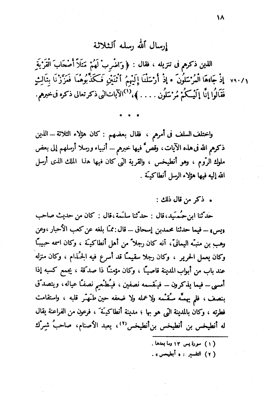 الذين ذكرهم في تنزيله، فقال: «وَاضْرِبْ لَهُمْ مَثَلًا أَصْحابَ الْقَرْيَةِ إِذْ جاءَهَا الْمُرْسَلُونَ إِذْ أَرْسَلْنا إِلَيْهِمُ اثْنَيْنِ فَكَذَّبُوهُما فَعَزَّزْنا بِثالِثٍ فَقالُوا إِنَّا إِلَيْكُمْ مُرْسَلُونَ» ، الآيات التي ذكر تعالي ذكره في خبرهم.