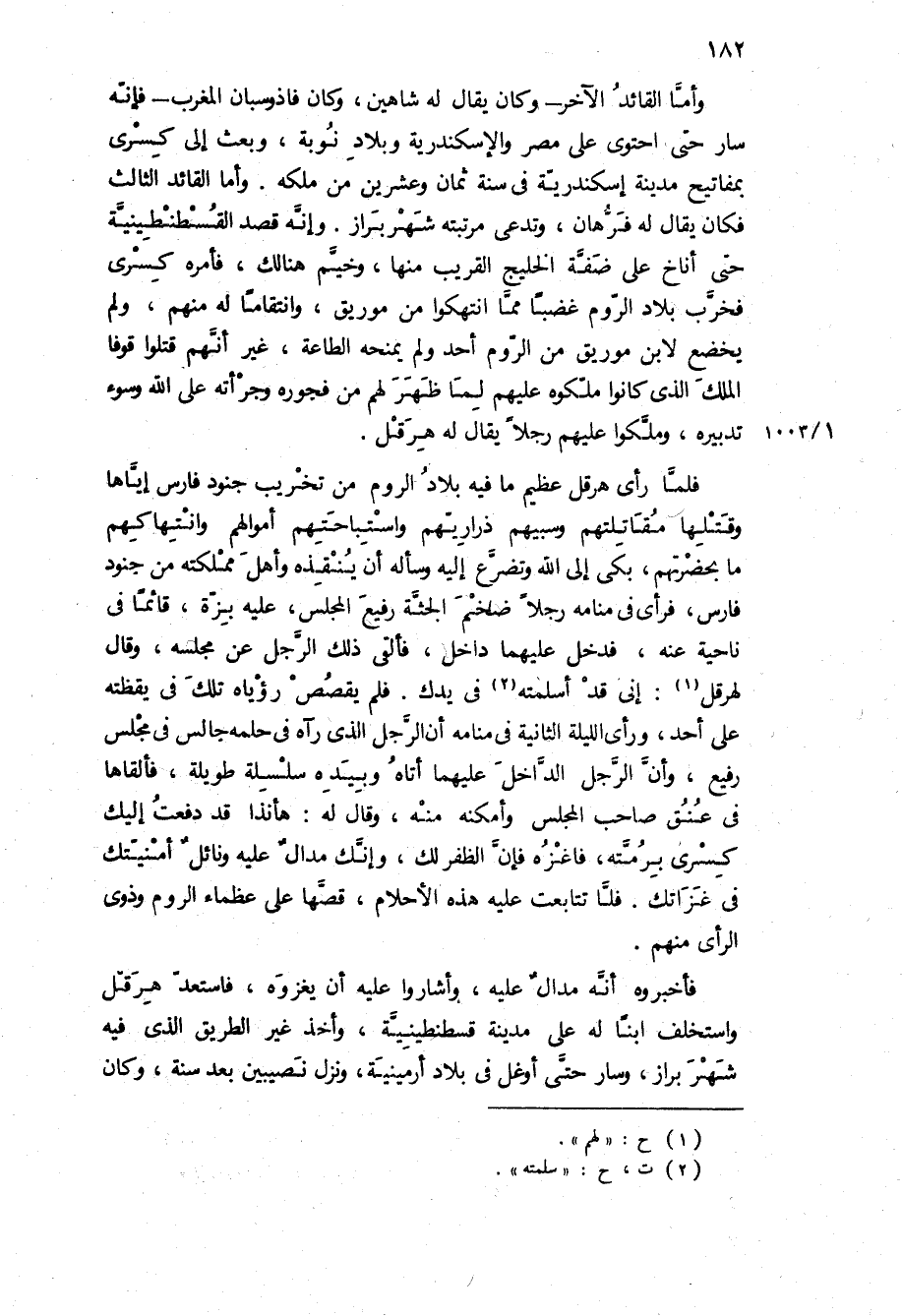 فلما رأى هرقل عظيم ما فيه بلاد الروم من تخريب جنود فارس إياها وقتلها مقاتلتهم وسبيهم ذراريهم واستباحتهم أموالهم وانتهاكهم ما بحضرتهم، بكى إلى الله وتضرع إليه وسأله أن ينقذه وأهل مملكته من جنود فارس، فرأى في منامه رجلا ضخم الجثة رفيع المجلس، عليه بزة، قائما في ناحية عنه، فدخل عليهما داخل، فألقى ذلك الرجل عن مجلسه، وقال لهرقل: إني قد أسلمته في يدك فلم يقصص رؤياه تلك في يقظته على أحد، ورأى الليلة الثانية في منامه أن الرجل الذي رآه في حلمه جالس في مجلس رفيع، وأن الرجل الداخل عليهما أتاه وبيده سلسلة طويلة، فألقاها في عنق صاحب المجلس وأمكنه منه، وقال له: هأنذا قد دفعت إليك كسرى برمته، فاغزه فإن الظفر لك، وإنك مدال عليه ونائل أمنيتك في غزاتك فلما تتابعت عليه هذه الأحلام، قصها على عظماء الروم وذوي الرأي منهم.