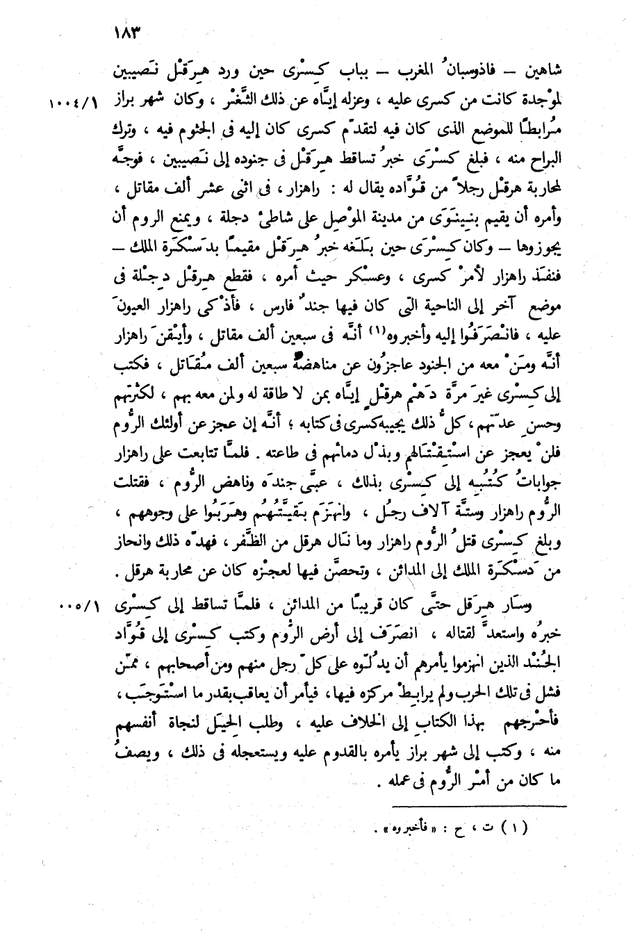 شاهين- فاذوسبان المغرب- بباب كسرى حين ورد هرقل نصيبين لموجدة كانت من كسرى عليه، وعزله إياه عن ذلك الثغر، وكان شهربراز مرابطا للموضع الذي كان فيه لتقدم كسرى كان إليه في الجثوم فيه، وترك البراح منه، فبلغ كسرى خبر تساقط هرقل في جنوده إلى نصيبين، فوجه لمحاربة هرقل رجلا من قواده يقال له: راهزار، في اثني عشر ألف مقاتل، وأمره أن يقيم بنينوى من مدينة الموصل على شاطئ دجلة، ويمنع الروم أن يجوزوها- وكان كسرى حين بلغه خبر هرقل مقيما بدسكرة الملك- فنفذ راهزار لأمر كسرى، وعسكر حيث أمره، فقطع هرقل دجلة في موضع آخر إلى الناحية التي كان فيها جند فارس، فأذكى راهزار العيون عليه، فانصرفوا إليه وأخبروه أنه في سبعين ألف مقاتل، وأيقن راهزار أنه ومن معه من الجنود عاجزون عن مناهضة سبعين ألف مقاتل، فكتب إلى كسرى غير مرة دهم هرقل إياه بمن لا طاقة له ولمن معه بهم، لكثرتهم وحسن عدتهم، كل ذلك يجيبه كسرى في كتابه، أنه إن عجز عن أولئك الروم فلن يعجز عن استقتالهم وبذل دمائهم في طاعته فلما تتابعت على راهزار جوابات كتبه إلى كسرى بذلك، عبى جنده وناهض الروم، فقتلت الروم راهزار وستة آلاف رجل، وانهزم بقيتهم وهربوا على وجوههم، وبلغ كسرى قتل الروم راهزار وما نال هرقل من الظفر، فهده ذلك وانحاز من دسكرة الملك إلى المدائن، وتحصن فيها لعجزه كان عن محاربة هرقل.