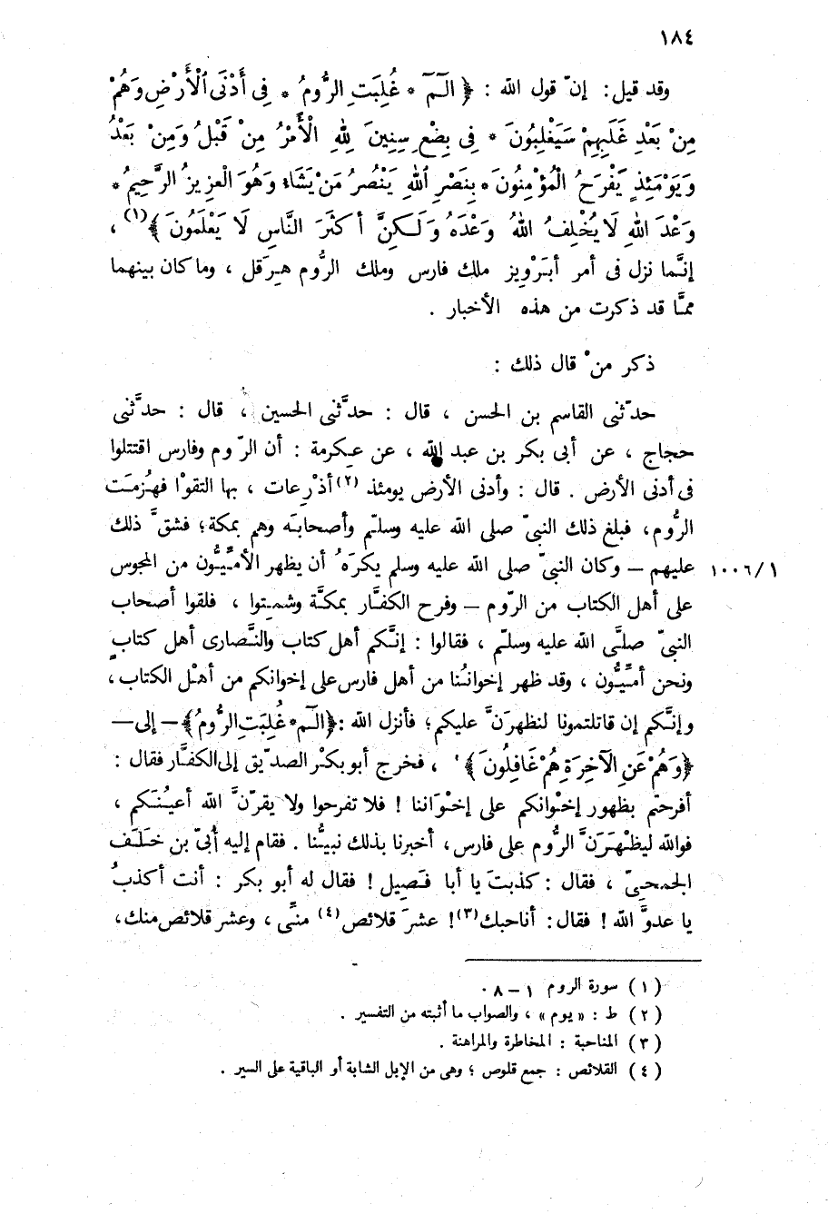 حَدَّثَنِي القاسم بن الحسن، قَالَ: حَدَّثَنِي الحسين، قَالَ: حَدَّثَنِي حجاج، عن أبي بكر بن عبد الله، عن عكرمة: أن الروم وفارس اقتتلوا في أدنى الأرض قَالَ: وأدنى الأرض يومئذ أذرعات، بها التقوا فهزمت الروم، فبلغ ذلك النبي ص وأصحابه وهم بمكة، فشق ذلك عليهم- وكان النبي ص يكره أن يظهر الأميون من المجوس على أهل الكتاب من الروم- وفرح الكفار بمكة وشمتوا، فلقوا اصحاب النبي ص، فقالوا: إنكم أهل كتاب والنصارى أهل كتاب ونحن أميون، وقد ظهر إخواننا من أهل فارس على إخوانكم من أهل الكتاب، وإنكم إن قاتلتمونا لنظهرن عليكم، فأنزل الله: «الم غُلِبَتِ الرُّومُ» - إلى- «وَهُمْ عَنِ الْآخِرَةِ هُمْ غافِلُونَ» ، فخرج أبو بكر الصديق إلى الكفار فقال: