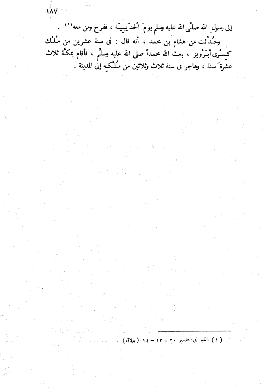 وحدثت عن هشام بن مُحَمَّد، أنه قَالَ: في سنة عشرين من ملك كسرى أبرويز، بعث الله محمدا ص، فأقام بمكة ثلاث عشرة سنة، وهاجر في سنه ثلاث وثلاثين من ملكه الى المدينة