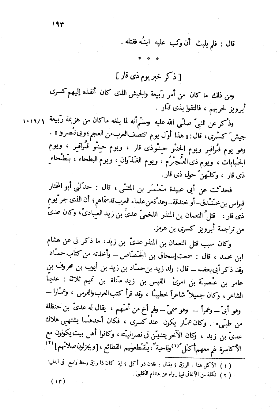فحدثت عن أبي عبيدة معمر بن المثنى، قال: حدثني ابو المختار فراس بن خندق- او خندقه- وعدة من علماء العرب قد سماهم، أن الذي جر يوم ذي قار، قتل النعمان بن المنذر اللخمي عدي بن زيد العبادي، وكان عدي من تراجمة أبرويز كسرى بن هرمز.