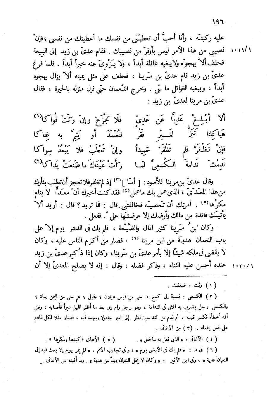 عليه ركبته، وأنا أحب أن تعطيني من نفسك ما أعطيتك من نفسي، فإن نصيبي من هذا الأمر ليس بأوفر من نصيبك فقام عدي بن زيد إلى البيعة فحلف ألا يهجوه ولا يبغيه غائلة أبدا، ولا يزوي عنه خبرا أبدا فلما فرغ عدي بن زيد قام عدي بن مرينا، فحلف على مثل يمينه الا يزال يهجوه أبدا، ويبغيه الغوائل ما بقي وخرج النعمان حتى نزل منزله بالحيرة، فقال عدي بن مرينا لعدي بن زيد: