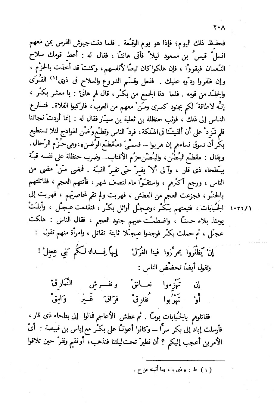 فحفظ ذلك اليوم، فإذا هو يوم الوقعة فلما دنت جيوش الفرس بمن معهم انسل قيس بن مسعود ليلا فأتى هانئا، فقال له: أعط قومك سلاح النعمان فيقووا، فإن هلكوا كان تبعا لأنفسهم، وكنت قد أخذت بالحزم، وان ظفروا ردوه عليك ففعل وقسم الدروع والسلاح في ذوي القوى والجلد من قومه فلما دنا الجمع من بكر، قال لهم هانئ: يا معشر بكر، إنه لا طاقة لكم بجنود كسرى ومن معهم من العرب، فاركبوا الفلاة فتسارع الناس إلى ذلك، فوثب حنظلة بن ثعلبة بن سيار فقال له: إنما أردت نجاتنا فلم تزد على أن ألقيتنا في الهلكة، فرد الناس وقطع وضن الهوادج لئلا تستطيع بكر أن تسوق نساءهم إن هربوا- فسمي مقطع الوضن، وهي حزم الرحال ويقال: مقطع البطن، والبطن حزم الأقتاب- وضرب حنظلة على نفسه قبة ببطحاء ذي قار، وآلى ألا يفر حتى تفر القبة فمضى من مضى من الناس، ورجع أكثرهم، واستقوا ماء لنصف شهر، فأتتهم العجم، فقاتلتهم بالحنو، فجزعت العجم من العطش، فهربت ولم تقم لمحاصرتهم، فهربت إلى الجبابات، فتبعتهم بكر، وعجل أوائل بكر، فتقدمت عجل، وأبلت يومئذ بلاء حسنا، واضطمت عليهم جنود العجم، فقال الناس: هلكت عجل، ثم حملت بكر فوجدوا عجلا ثابتة تقاتل، وامرأة منهم تقول: