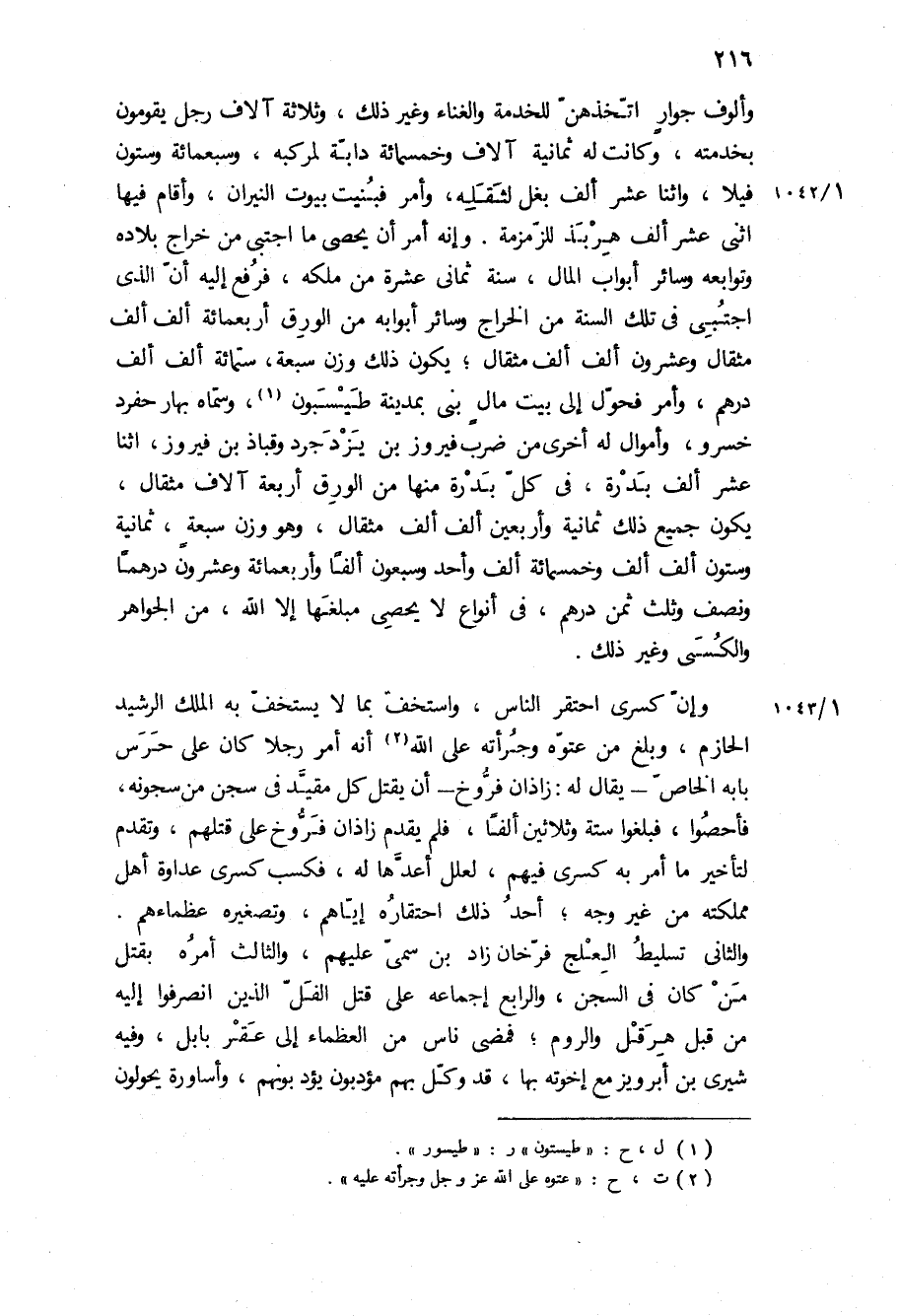 وألوف جوار اتخذهن للخدمة والغناء وغير ذلك، وثلاثة آلاف رجل يقومون بخدمته، وكانت له ثمانية آلاف وخمسمائة دابه لمركبه، وسبعمائة وستون فيلا، واثنا عشر ألف بغل لثقله، وأمر فبنيت بيوت النيران، وأقام فيها اثني عشر ألف هربذ للزمزمة وأنه أمر أن يحصى ما اجتبي من خراج بلاده وتوابعه وسائر أبواب المال، سنة ثماني عشرة من ملكه، فرفع إليه أن الذي اجتبي في تلك السنة من الخراج وسائر أبوابه من الورق أربعمائة ألف ألف مثقال وعشرون ألف ألف مثقال، يكون ذلك وزن سبعه، ستمائه ألف ألف درهم، وأمر فحول إلى بيت مال بنى بمدينه طيسبون، وسماه بهار حفرد خسرو، وأموال له أخرى من ضرب فيروز بن يزدجرد وقباذ بن فيروز، اثنا عشر ألف بدرة، في كل بدرة منها من الورق أربعة آلاف مثقال، يكون جميع ذلك ثمانية وأربعين ألف ألف مثقال، وهو وزن سبعه، ثمانية وستون الف الف وخمسمائة الف واحد وسبعون ألفا وأربعمائة وعشرون درهما ونصف وثلث ثمن درهم، في أنواع لا يحصي مبلغها إلا الله، من الجواهر والكسي وغير ذلك.