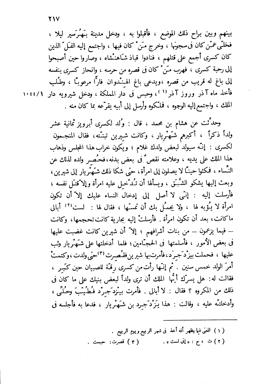 وحدثت عن هشام بن محمد، قال: ولد لكسرى أبرويز ثمانية عشر ولدا ذكرا، أكبرهم شهريار، وكانت شيرين تبنته، فقال المنجمون لكسرى: إنه سيولد لبعض ولدك غلام، ويكون خراب هذا المجلس وذهاب هذا الملك على يديه، وعلامته نقص في بعض بدنه، فحصر ولده لذلك عن النساء، فمكثوا حينا لا يصلون إلى امرأة، حتى شكا ذلك شهريار إلى شيرين، وبعث إليها يشكو الشبق، ويسألها أن تدخل عليه امرأة وإلا قتل نفسه، فأرسلت إليه: إني لا أصل إلى إدخال النساء عليك إلا أن تكون امرأة لا يؤبه لها، ولا يجمل بك أن تمسها، فقال لها: لست أبالي ما كانت، بعد أن تكون امرأة فأرسلت إليه بجارية كانت تحجمها، وكانت- فيما يزعمون- من بنات أشرافهم، إلا أن شيرين كانت غضبت عليها في بعض الأمور، فأسلمتها في الحجامين، فلما أدخلتها على شهريار وثب عليها، فحملت بيزدجرد، فأمرت بها شيرين فقصرت حتى ولدت، وكتمت أمر الولد خمس سنين ثم إنها رأت من كسرى رقة للصبيان حين كبر، فقالت له: هل يسرك أيها الملك أن ترى ولدا لبعض بنيك على ما كان في ذلك من المكروه؟ فقال: لا أبالي فأمرت بيزدجرد فطيب وحلي، وأدخلته عليه، وقالت: هذا يزدجرد بن شهريار، فدعا به فأجلسه في