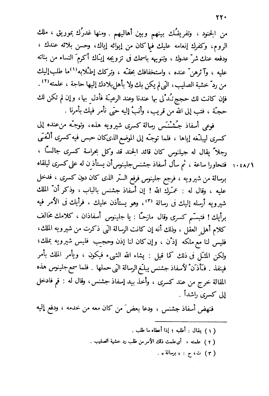 من الجنود، وتفريقك بينهم وبين أهاليهم ومنها غدرك بموريق، ملك الروم، وكفرك إنعامه عليك فيما كان من إيوائه إياك، وحسن بلائه عندك، ودفعه عنك شر عدوك، وتنويهه باسمك في تزويجه إياك اكرم النساء من بناته عليه، وآثرهن عنده، واستخفافك بحقه، وتركك إطلابه ما طلب إليك من رد خشبة الصليب، التي لم يكن بك ولا بأهل بلادك إليها حاجة، علمته.