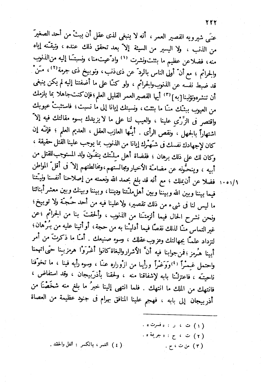 عني شيرويه القصير العمر، أنه لا ينبغي لذي عقل أن يبث من أحد الصغير من الذنب، ولا اليسير من السيئة إلا بعد تحقق ذلك عنده، وتيقنه إياه منه، فضلا عن عظيم ما بثثت ونشرت وادعيت منا، ونسبتنا إليه من الذنوب والجرائم، مع أن أولى الناس بالرد عن ذي ذنب، وتوبيخ ذي جرمة، من قد ضبط نفسه عن الذنوب والجرائم، ولو كنا على ما أضفتنا إليه لم يكن ينبغي أن تنشره وتؤنبنا به أيها القصير العمر القليل العلم، فإن كنت جاهلا بما يلزمك من العيوب ببثك منا ما بثثت، ونسبتك إيانا إلى ما نسبت، فاستثبت عيوبك واقتصر في الزري علينا، والعيب لنا على ما لا يزيدك بسوء مقالتك فيه إلا اشتهارا بالجهل، ونقص الرأي أيها العازب العقل، العديم العلم، فإنه إن كان لإجهادك نفسك في شهرك إيانا من الذنوب بما يوجب علينا القتل حقيقة، وكان لك على ذلك برهان، فقضاة أهل ملتك ينفون ولد المستوجب للقتل من أبيه، وينحونه عن مضامة الأخيار ومجالستهم، ومخالطتهم إلا في أقل المواطن فضلا عن أن يملك، مع أنه قد بلغ بحمد الله ونعمته من إصلاحنا أنفسنا ونيتنا فيما بيننا وبين الله وبيننا وبين أهل ملتنا وديننا، وبيننا وبينك وبين معشر أبنائنا ما ليس لنا في شيء من ذلك تقصير، ولا علينا فيه من أحد حجة ولا توبيخ، ونحن نشرح الحال فيما ألزمتنا من الذنوب، وألحقت بنا من الجرائم، عن غير التماس منا لذلك نقصا فيما أدلينا به من حجة، أو أتينا عليه من برهان، لتزداد علما بجهالتك وعزوب عقلك، وسوء صنيعك أما ما ذكرت من أمر أبينا هرمز، فمن جوابنا فيه أن الأشرار والبغاة كانوا أغروا هرمز بنا حتى اتهمنا واحتمل غمرا ووغرا ورأينا من ازوراره عنا، وسوء رأيه فينا، ما تخوفنا ناحيته، فاعتزلنا بابه لإشفاقنا منه، ولحقنا بأذربيجان، وقد استفاض، فانتهك من الملك ما انتهك فلما انتهى إلينا خبر ما بلغ منه شخصنا من أذربيجان إلى بابه، فهجم علينا المنافق بهرام في جنود عظيمة من العصاة