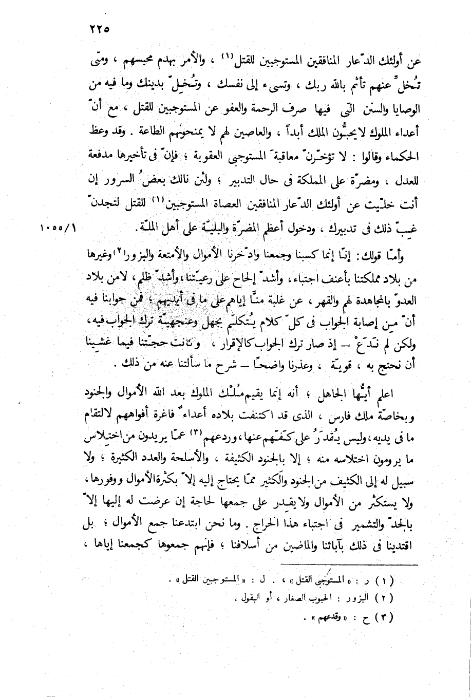 اعلم أيها الجاهل، أنه إنما يقيم ملك الملوك بعد الله الأموال والجنود وبخاصة ملك فارس، الذي قد اكتنفت بلاده أعداء فاغرة أفواههم لالتقام ما في يديه، وليس يقدر على كفهم عنها، وردعهم عما يريدون من اختلاس ما يرومون اختلاسه منه، إلا بالجنود الكثيفة، والأسلحة والعدد الكثيرة، ولا سبيل له إلى الكثيف من الجنود والكثير مما يحتاج إليه إلا بكثرة الأموال ووفورها، ولا يستكثر من الأموال ولا يقدر على جمعها لحاجة إن عرضت له إليها إلا بالجد والتشمير في اجتباء هذا الخراج وما نحن ابتدعنا جمع الأموال، بل اقتدينا في ذلك بآبائنا والماضين من أسلافنا، فإنهم جمعوها كجمعنا إياها،
