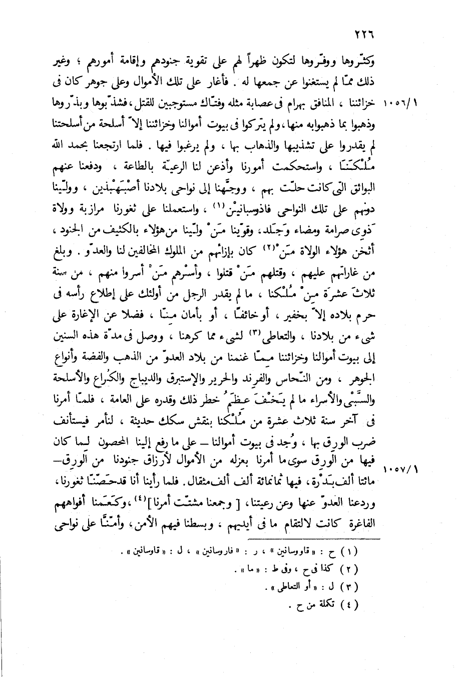 وكثروها ووفروها لتكون ظهرا لهم على تقوية جنودهم وإقامة أمورهم، وغير ذلك مما لم يستغنوا عن جمعها له فأغار على تلك الأموال وعلى جوهر كان في خزائننا، المنافق بهرام في عصابة مثله وفتاك مستوجبين القتل، فشذبوها وبذروها وذهبوا بما ذهبوا به منها، ولم يتركوا في بيوت أموالنا وخزائننا إلا أسلحة من أسلحتنا لم يقدروا على تشذيبها والذهاب بها، ولم يرغبوا فيها فلما ارتجعنا بحمد الله ملكنا، واستحكمت أمورنا وأذعن لنا الرعية بالطاعة، ودفعنا عنهم البوائق التي كانت حلت بهم، ووجهنا إلى نواحي بلادنا أصبهبذين، وولينا دونهم على تلك النواحي فاذوسبانين، واستعملنا على ثغورنا مرازبة وولاة ذوي صرامة ومضاء وجلد، وقوينا من ولينا من هؤلاء بالكثيف من الجنود، أثخن هؤلاء الولاة من كان بإزائهم من الملوك المخالفين لنا والعدو وبلغ من غاراتهم عليهم، وقتلهم من قتلوا، وأسرهم من أسروا منهم، من سنة ثلاث عشرة من ملكنا، ما لم يقدر الرجل من أولئك على إطلاع رأسه في حرم بلاده إلا بخفير، أو خائفا، أو بأمان منا، فضلا عن الإغارة على شيء من بلادنا، والتعاطي لشيء مما كرهنا، ووصل في مدة هذه السنين إلى بيوت أموالنا وخزائننا مما غنمنا من بلاد العدو من الذهب والفضة وأنواع الجوهر، ومن النحاس والفرند والحرير والإستبرق والديباج والكراع والأسلحة والسبي والأسراء ما لم يخف عظم خطر ذلك وقدره على العامة، فلما أمرنا في آخر سنة ثلاث عشرة من ملكنا بنقش سكك حديثة، لنأمر فيستأنف ضرب الورق بها، وجد في بيوت أموالنا- على ما رفع إلينا المحصون لما كان فيها من الورق سوى ما أمرنا بعزله من الأموال لأرزاق جنودنا من الورق- مائتا الف بدره، فيها ثمانمائه ألف ألف مثقال فلما رأينا أنا قد حصنا ثغورنا، وردعنا العدو عنها وعن رعيتنا، وجمعنا مشتت أمرنا، وكعمنا أفواههم الفاغرة كانت لالتقام ما في أيديهم، وبسطنا فيهم الأمن، وأمنا على نواحي