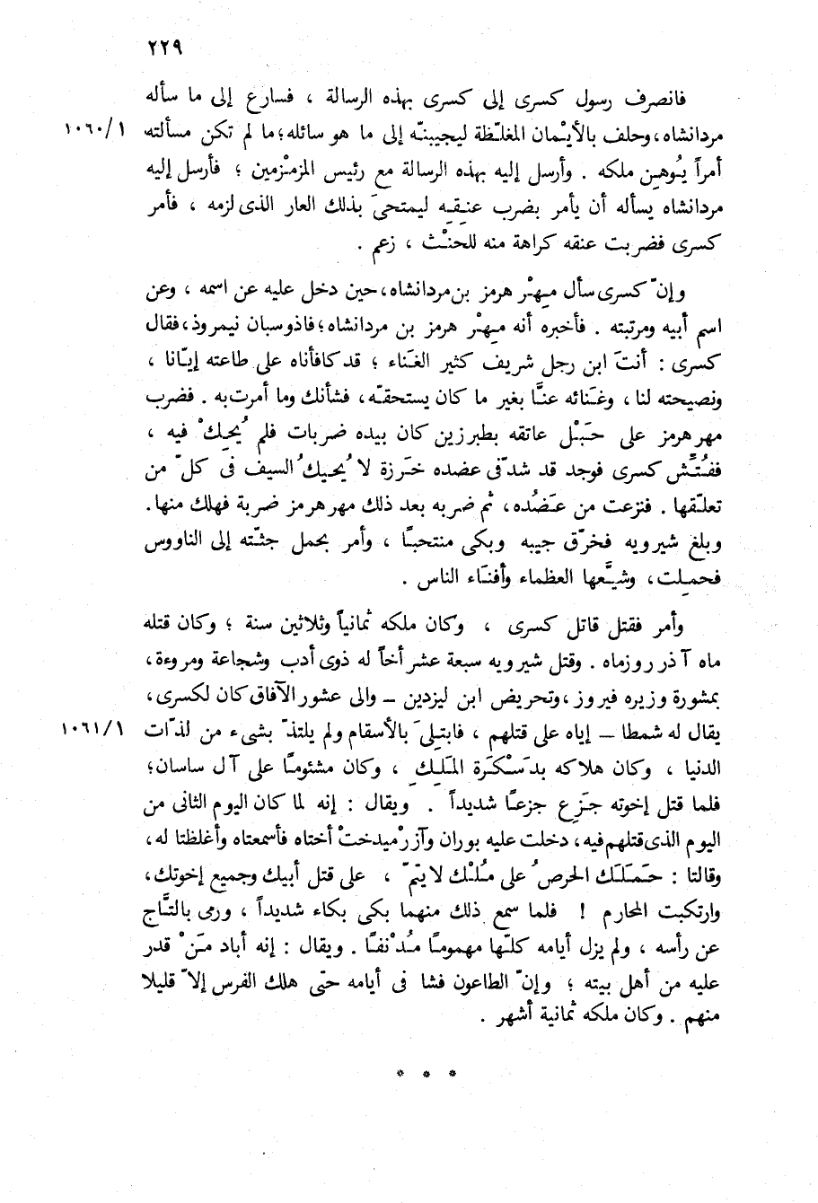 وان كسرى سال مهر هرمز بن مردان شاه، حين دخل عليه عن اسمه، وعن اسم ابيه ومرتبته فاخبره انه مهر هرمز بن مردان شاه، فاذوسبان نيمروذ، فقال كسرى: أنت ابن رجل شريف كثير الغناء، قد كافأناه على طاعته إيانا، ونصيحته لنا، وغنائه عنا بغير ما كان يستحقه، فشأنك وما أمرت به فضرب مهر هرمز على حبل عاتقه بطبرزين كان بيده ضربات فلم يحك فيه، ففتش كسرى فوجد قد شد في عضده خرزه لا يحيك السيف في كل من تعلقها فنزعت من عضده، ثم ضربه بعد ذلك مهر هرمز ضربة فهلك منها.