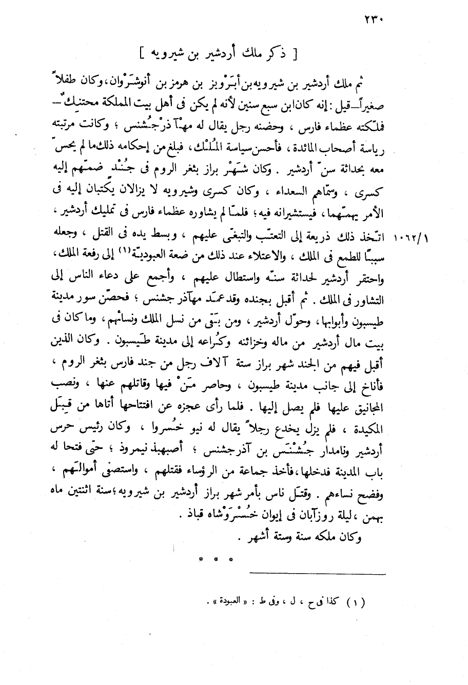 ثم ملك أردشير بن شيرويه بن ابرويز بن هرمز بن انوشروان، وكان طفلا صغيرا- قيل: إنه كان ابن سبع سنين لأنه لم يكن في أهل بيت المملكة محتنك- فملكته عظماء فارس، وحضنه رجل يقال له مهاذرجشنس، وكانت مرتبته رئاسة أصحاب المائدة، فأحسن سياسة الملك، فبلغ من إحكامه ذلك ما لم يحس معه بحداثة سن أردشير وكان شهربراز بثغر الروم في جند ضمهم إليه كسرى وسماهم السعداء، وكان كسرى وشيرويه لا يزالان يكتبان إليه في الأمر يهمهما، فيستشيرانه فيه، فلما لم يشاوره عظماء فارس في تمليك أردشير.