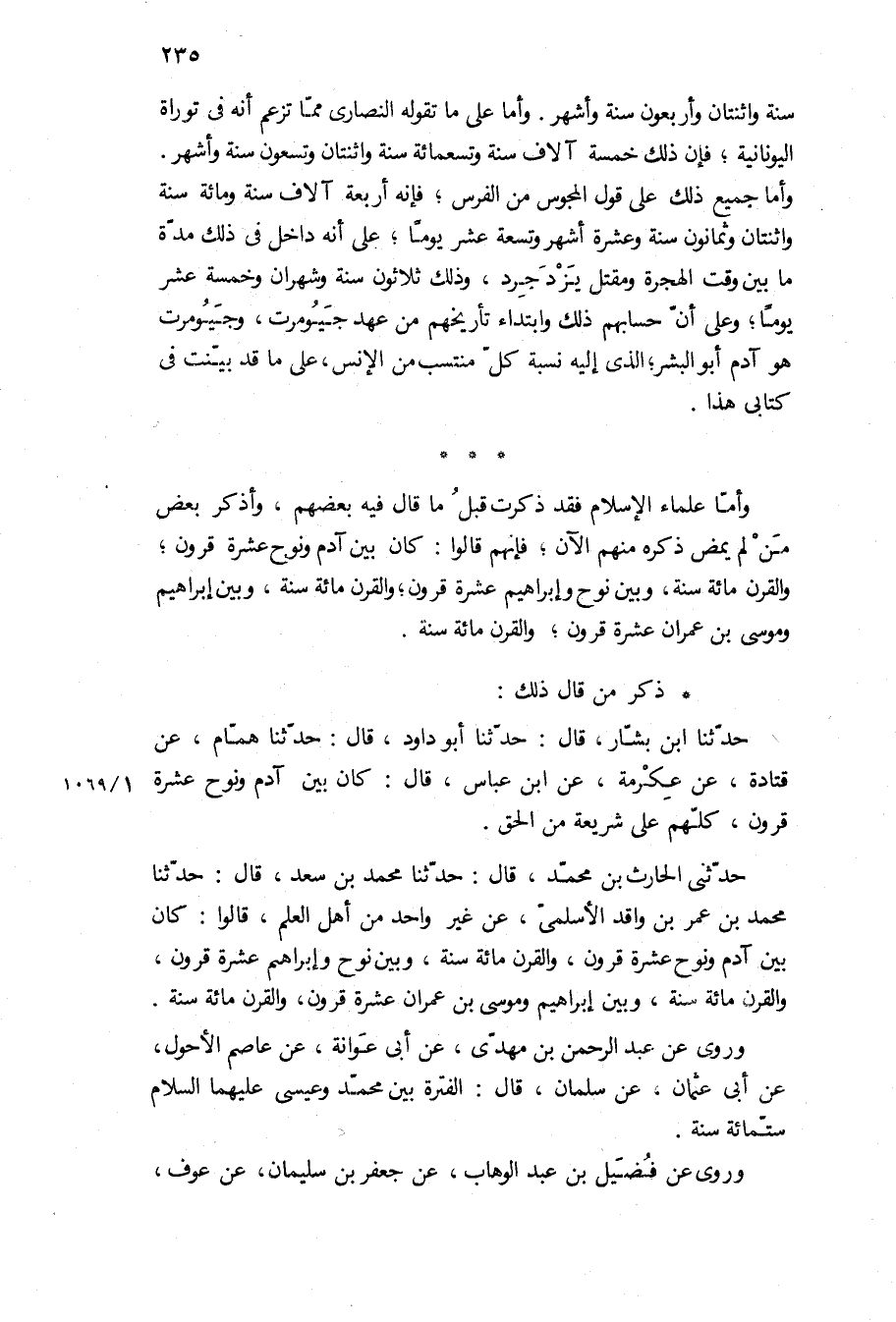 وأما علماء الإسلام فقد ذكرت قبل ما قال فيه بعضهم، وأذكر بعض من لم يمض ذكره منهم الآن، فإنهم قالوا: كان بين آدم ونوح عشرة قرون، والقرن مائة سنة، وبين نوح وإبراهيم عشرة قرون، والقرن مائة سنة، وبين إبراهيم وموسى بن عمران عشرة قرون، والقرن مائة سنة.