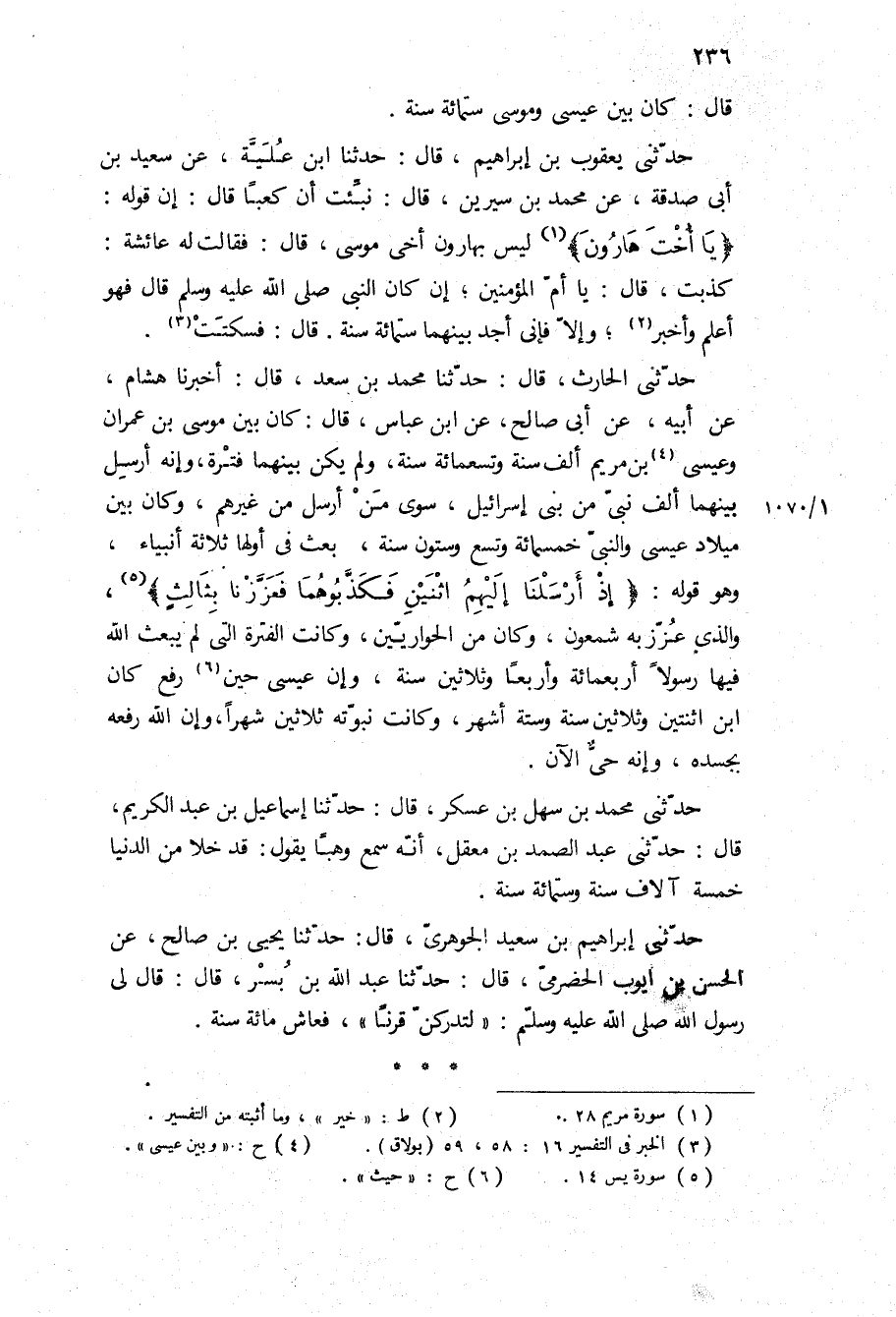 حَدَّثَنِي الْحَارِثُ، قَالَ: حَدَّثَنَا مُحَمَّدُ بْنُ سَعْدٍ، قَالَ: أَخْبَرَنَا هِشَامٌ، عَنْ أَبِيهِ، عَنْ أَبِي صَالِحٍ، عَنِ ابْنِ عَبَّاسٍ، قَالَ: كَانَ بَيْنَ مُوسَى بْنِ عِمْرَانَ وَعِيسَى بن مريم الف سنه وتسعمائة سَنَةٍ، وَلَمْ يَكُنْ بَيْنَهُمَا فَتْرَةٌ، وَإِنَّهُ أُرْسِلَ بَيْنَهُمَا أَلْفُ نَبِيٍّ مِنْ بَنِي إِسْرَائِيلَ، سِوَى مَنْ أُرْسِلَ مِنْ غَيْرِهِمْ، وَكَانَ بَيْنَ مِيلادِ عيسى والنبي خمسمائة وَتِسْعٌ وَسِتُّونَ سَنَةٍ، بُعِثَ فِي أَوَّلِهَا ثَلاثَةُ أَنْبِيَاءَ، وَهُوَ قَوْلُهُ: «إِذْ أَرْسَلْنا إِلَيْهِمُ اثْنَيْنِ فَكَذَّبُوهُما فَعَزَّزْنا بِثالِثٍ» ، وَالَّذِي عُزِّزَ بِهِ شَمْعُونُ، وَكَانَ مِنَ الْحَوَارِيِّينَ، وَكَانَتِ الْفَتْرَةُ الَّتِي لَمْ يَبْعَثِ اللَّهُ فِيهَا رسولا أربعمائة وَأَرْبَعًا وَثَلاثِينَ سَنَةٍ، وَإِنَّ عِيسَى حِينَ رُفِعَ كَانَ ابْنَ اثْنَتَيْنِ وَثَلاثِينَ سَنَةً وَسِتَّةِ أَشْهُرٍ، وَكَانَتْ نُبُوَّتُهُ ثَلاثِينَ شَهْرًا، وَإِنَّ اللَّهَ رَفَعَهُ بِجَسَدِهِ، وَإِنَّهُ حَيٌّ الآنَ.