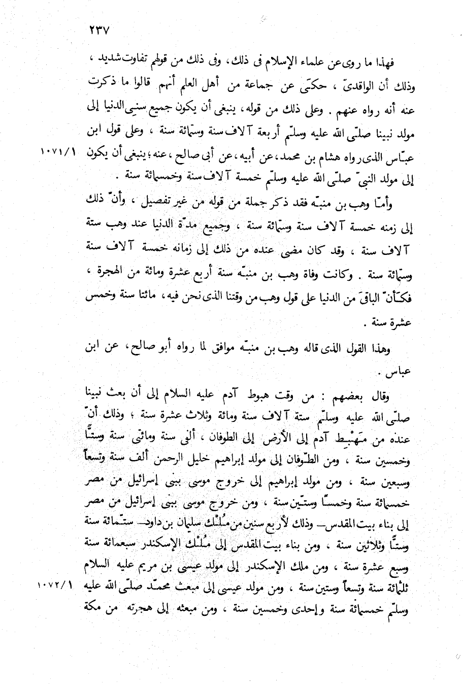 فهذا ما روي عن علماء الإسلام في ذلك، وفي ذلك من قولهم تفاوت شديد، وذلك أن الواقدي، حكى عن جماعة من أهل العلم أنهم قالوا ما ذكرت عنه أنه رواه عنهم وعلى ذلك من قوله، ينبغي أن يكون جميع سني الدنيا إلى مولد نبينا ص اربعه آلاف سنه وستمائه سنة، وعلى قول ابْنِ عَبَّاسٍ الذي رواه هشام بن محمد، عن أبيه، عن أبي صالح، عنه، ينبغي أن يكون إلى مولد النبي ص خمسه آلاف سنه وخمسمائة سنة.
