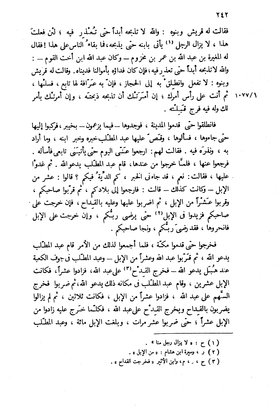فقالت له قريش وبنوه: والله لا تذبحه أبدا حتى تعذر فيه، لئن فعلت هذا، لا يزال الرجل يأتي بابنه حتى يذبحه، فما بقاء الناس على هذا! فقال له المغيرة بْن عبد الله بْن عمر بْن مخزوم- وكان عبد الله ابن أخت القوم-: