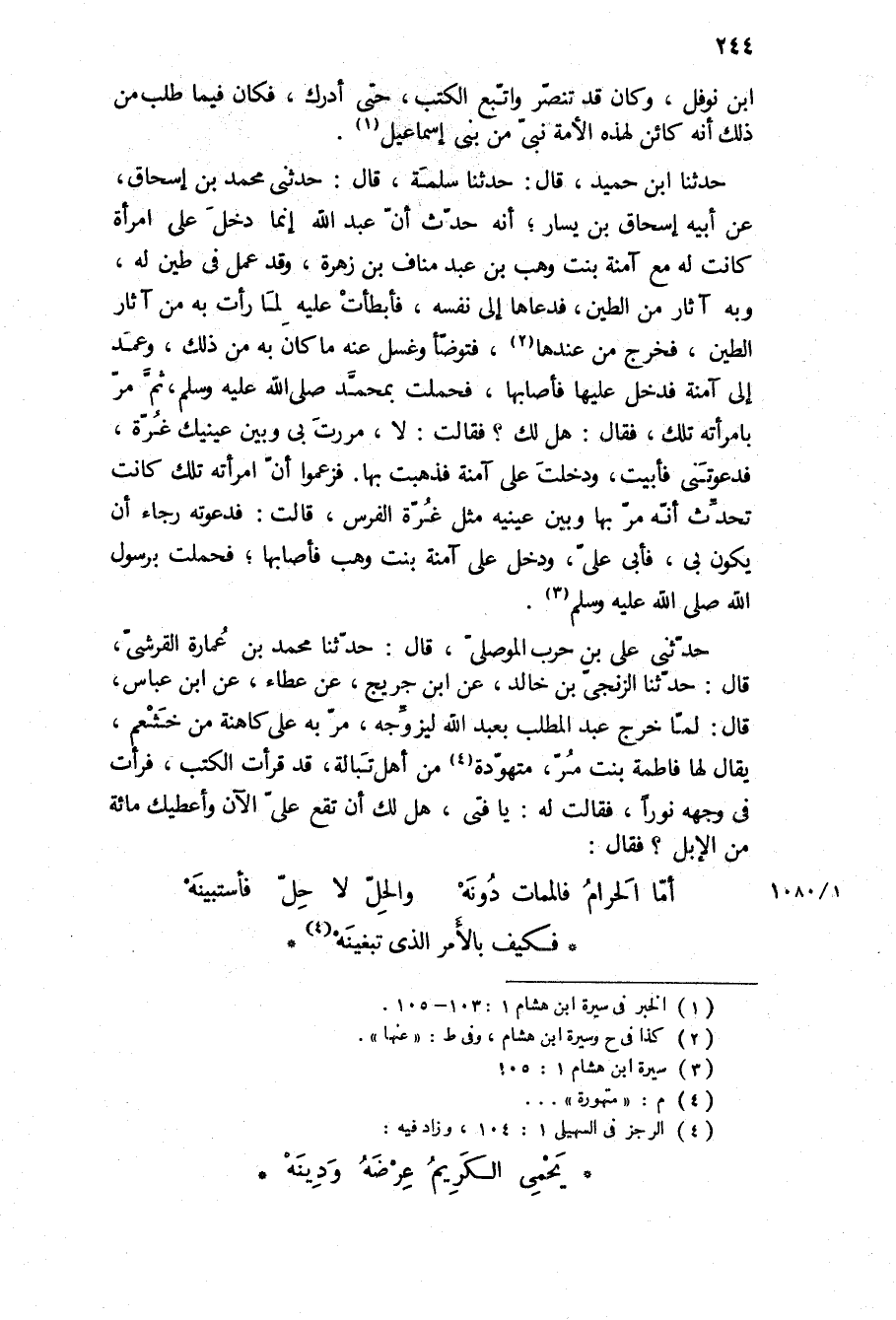 حَدَّثَنِي عَلِيُّ بْنُ حَرْبٍ الْمَوْصِلِيُّ، قَالَ: حَدَّثَنَا مُحَمَّدُ بْنُ عُمَارَةَ الْقُرَشِيُّ، قَالَ: حَدَّثَنَا الزِّنْجِيُّ بْنُ خَالِدٍ، عَنِ ابْنِ جُرَيْجٍ، عَنْ عَطَاءٍ، عَنِ ابْنِ عَبَّاسٍ، قَالَ: لَمَّا خَرَجَ عَبْدُ الْمُطَّلِبِ بِعَبْدِ اللَّهِ لِيُزَوِّجَهُ، مَرَّ بِهِ عَلَى كَاهِنَةٍ مِنْ خَثْعَمٍ، يُقَالُ لَهَا فَاطِمَةُ بِنْتُ مُرٍّ، مُتَهَوِّدَةٌ مِنْ أَهْلِ تَبَالَةَ، قَدْ قَرَأَتِ الْكُتُبَ، فَرَأَتْ فِي وَجْهِهِ نُورًا، فَقَالَتْ لَهُ: يَا فَتَى، هَلْ لَكَ أَنْ تَقَعَ عَلَيَّ الآنَ وَأُعْطِيَكَ مِائَةً مِنَ الإِبِلِ؟ فَقَالَ: