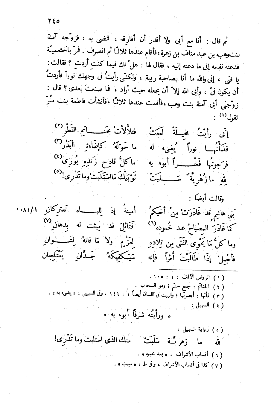 زَوَّجَنِي أَبِي آمِنَةَ بِنْتَ وَهْبٍ، فَأَقَمْتُ عِنْدَهَا ثَلاثًا، فَأَنْشَأَتْ فَاطِمَةُ بِنْتُ مُرٍّ تَقُولُ: