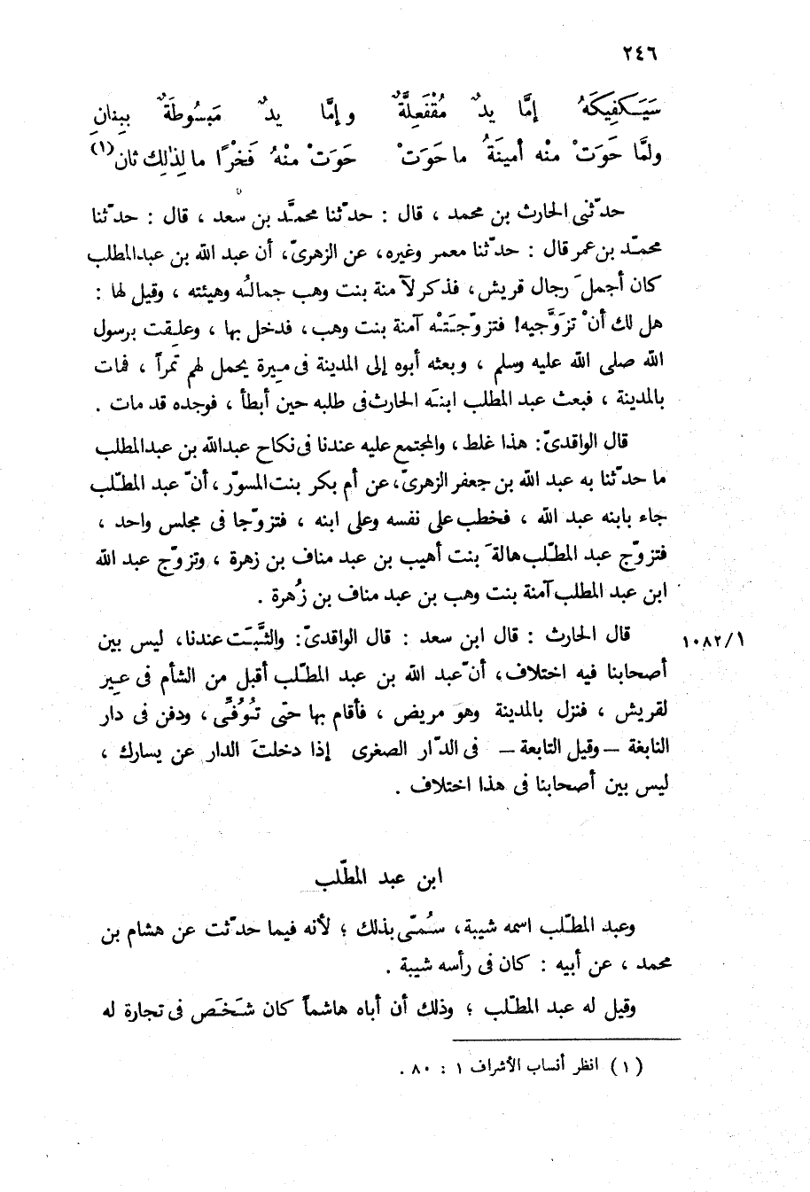 حدثني الحارث بْن محمد، قَالَ: حَدَّثَنَا مُحَمَّدُ بْنُ سَعْدٍ، قَالَ: حَدَّثَنَا مُحَمَّدُ بْنُ عُمَرَ قَالَ: حدثنا معمر وغيره، عن الزهري، أن عبد الله بن عبد المطلب كان أجمل رجال قريش، فذكر لآمنة بنت وهب جماله وهيئته، وقيل لها: