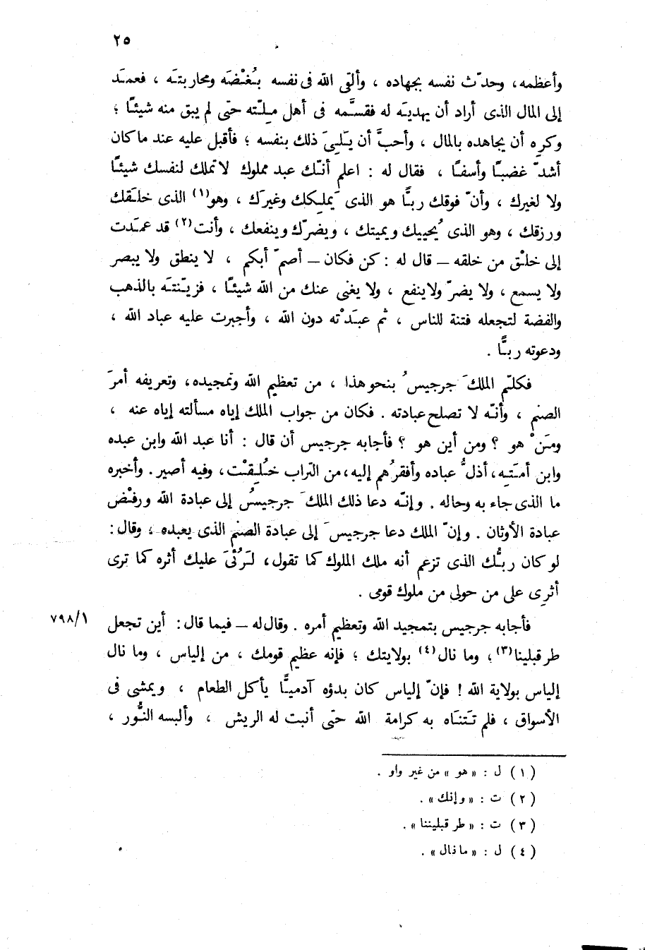 فأجابه جرجيس بتمجيد الله وتعظيم أمره وقال له- فيما قَالَ: أين تجعل طرقبلينا، وما نال بولايتك، فإنه عظيم قومك، من إلياس، وما نال إلياس بولاية الله! فإن إلياس كان بدؤه آدميا يأكل الطعام، ويمشي في الأسواق، فلم تتناه به كرامة الله حتى أنبت له الريش، وألبسه النور،