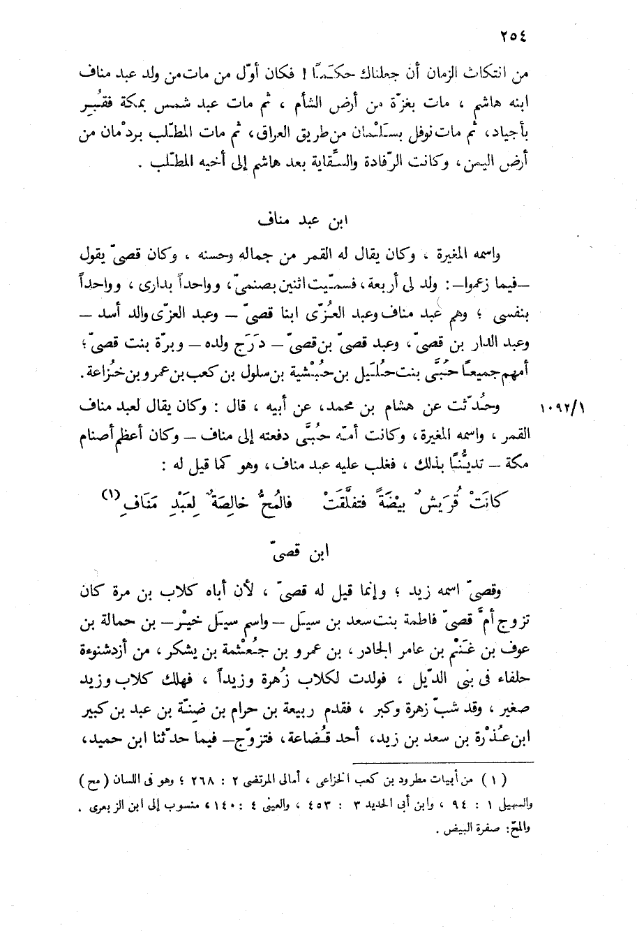 وحدثت عن هشام بن محمد، عن أبيه، قال: وكان يقال لعبد مناف القمر، واسمه المغيرة، وكانت أمه حبى دفعته إلى مناف- وكان أعظم أصنام مكة- تدينا بذلك، فغلب عليه عبد مناف، وهو كما قيل له: