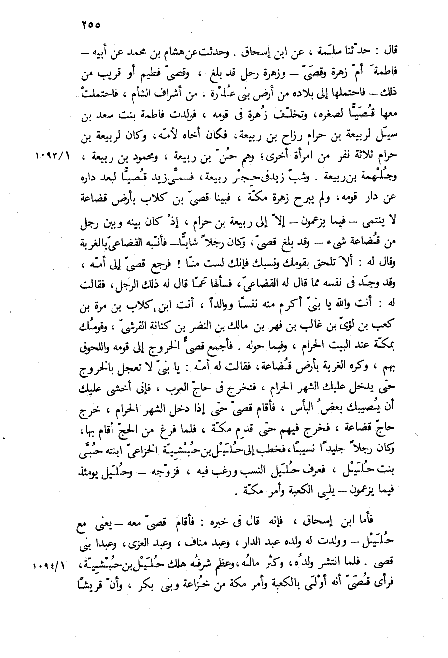 قال: حدثنا سلمة، عن ابن إسحاق وحدثت عن هشام بن محمد عن أبيه- فاطمة أم زهرة وقصي- وزهرة رجل قد بلغ، وقصي فطيم أو قريب من ذلك- فاحتملها إلى بلاده من أرض بني عذرة، من أشراف الشام، فاحتملت معها قصيا لصغره، وتخلف زهرة في قومه، فولدت فاطمة بنت سعد بن سيل لربيعة بن حرام رزاح بن ربيعة، فكان أخاه لأمه، وكان لربيعة بن حرام ثلاثة نفر من امرأة أخرى، وهم حن بن ربيعة، ومحمود بن ربيعة، وجلهمة بن ربيعة وشب زيد في حجر ربيعة، فسمي زيد قصيا لبعد داره عن دار قومه، ولم يبرح زهرة مكة، فبينا قصي بن كلاب بأرض قضاعة لا ينتمي- فيما يزعمون- إلا إلى ربيعة بن حرام، إذ كان بينه وبين رجل من قضاعة شيء- وقد بلغ قصي، وكان رجلا شابا- فأنبه القضاعي بالغربة وقال له: ألا تلحق بقومك ونسبك فإنك لست منا! فرجع قصي إلى أمه، وقد وجد في نفسه مما قال له القضاعي، فسألها عما قال له ذلك الرجل، فقالت له: أنت والله يا بني أكرم منه نفسا ووالدا، أنت ابن كلاب بْنِ مُرَّةَ بْنِ كَعْبِ بْنِ لُؤَيِّ بْنِ غالب بن فهر بن مالك بن النضر بن كنانة القرشي، وقومك بمكة عند البيت الحرام، وفيما حوله فأجمع قصي الخروج إلى قومه واللحوق بهم، وكره الغربة بأرض قضاعة، فقالت له أمه: يا بني لا تعجل بالخروج حتى يدخل عليك الشهر الحرام، فتخرج في حاج العرب، فإني أخشى عليك أن يصيبك بعض البأس، فأقام قصي حتى إذا دخل الشهر الحرام، خرج حاج قضاعة، فخرج فيهم حتى قدم مكة، فلما فرغ من الحج أقام بها، وكان رجلا جليدا نسيبا، فخطب إلى حليل بن حبشية الخزاعي ابنته حبى بنت حليل، فعرف حليل النسب ورغب فيه، فزوجه- وحليل يومئذ فيما يزعمون- يلي الكعبة وأمر مكة.