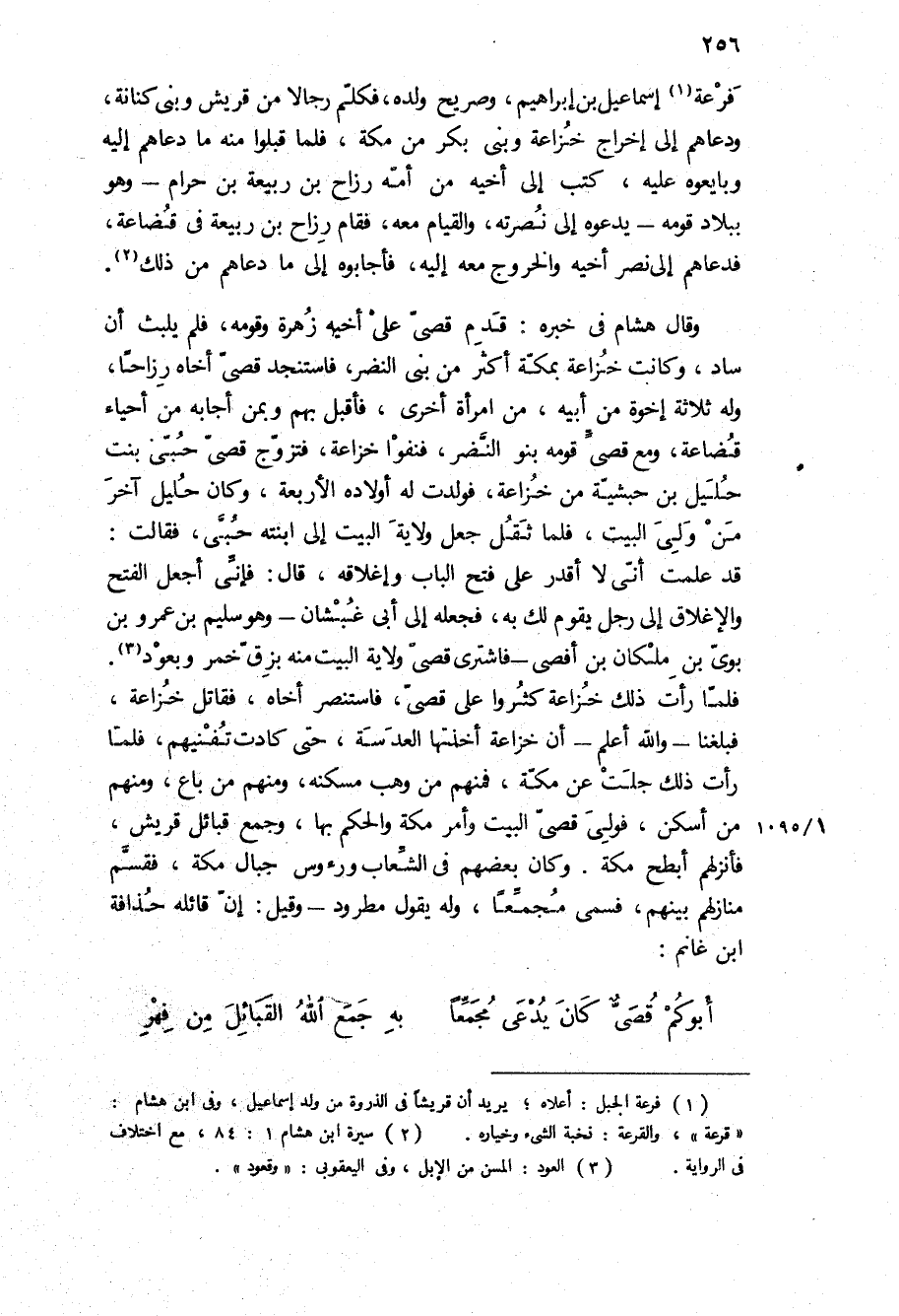 فبلغنا- والله أعلم- أن خزاعة أخذتها العدسة، حتى كادت تفنيهم، فلما رأت ذلك جلت عن مكة، فمنهم من وهب مسكنه، ومنهم من باع، ومنهم من أسكن، فولي قصي البيت وأمر مكة والحكم بها، وجمع قبائل قريش، فأنزلهم أبطح مكة وكان بعضهم في الشعاب ورءوس جبال مكة، فقسم منازلهم بينهم، فسمي مجمعا، وله يقول مطرود- وقيل: إن قائله حذافة ابن غانم: