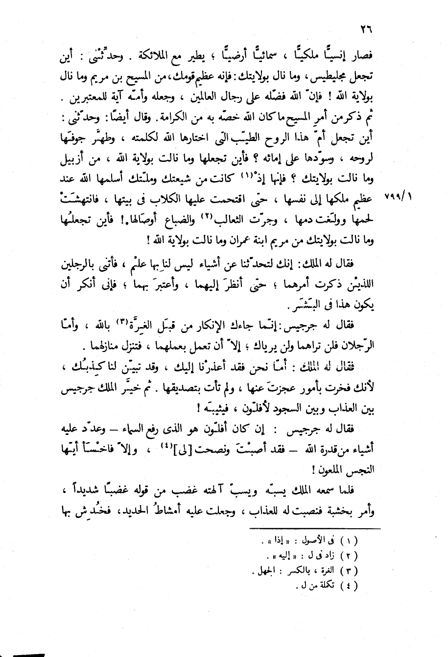 أين تجعل أم هذا الروح الطيب التي اختارها الله لكلمته، وطهر جوفها لروحه، وسودها على إمائه؟ فأين تجعلها وما نالت بولاية الله، من أزبيل وما نالت بولايتك؟ فإنها إذ كانت من شيعتك وملتك أسلمها الله عند عظيم ملكها إلى نفسها، حتى اقتحمت عليها الكلاب في بيتها، فانتهشت لحمها وولغت دمها، وجرت الثعالب والضباع أوصالها! فأين تجعلها وما نالت بولايتك من مريم ابنة عمران وما نالت بولاية الله! فقال له الملك: إنك لتحدثنا عن أشياء ليس لنا بها علم، فأتني بالرجلين اللذين ذكرت أمرهما، حتى أنظر إليهما، وأعتبر بهما، فإني أنكر أن يكون هذا في البشر.