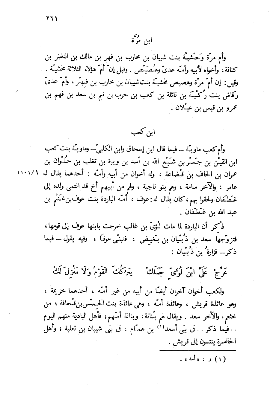 ولكعب أخوان آخران أيضا من أبيه من غير أمه، أحدهما خزيمة، وهو عائذة قريش، وعائذة أمه، وهي عائذة بنت الخمس بن قحافة، من خثعم، والآخر سعد ويقال لهم بنانة، وبنانة أمهم، فأهل البادية منهم اليوم- فيما ذكر- في بني أسعد بن همام في بني شيبان بن ثعلبة، وأهل الحاضرة ينتمون إلى قريش