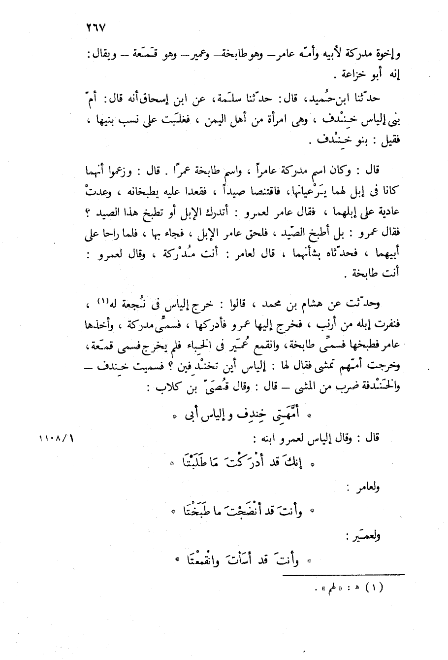 حَدَّثَنَا ابن حميد، قال: حَدَّثَنَا سلمة، عن ابن إسحاق أنه قال: أم بني إلياس خندف، وهي امرأة من أهل اليمن، فغلبت على نسب بنيها، فقيل: بنو خندف.