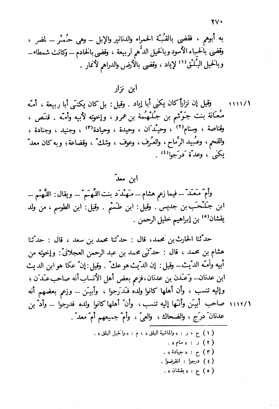 حدثنا الحارث بْن محمد، قَالَ: حَدَّثَنَا مُحَمَّدُ بْنُ سَعْدٍ، قَالَ: حَدَّثَنَا هِشَامُ بْنُ مُحَمَّدٍ، قَالَ: حدثني محمد بن عبد الرحمن العجلاني: وإخوته من أبيه وأمه الديث- وقيل: إن الديث هو عك وقيل: ان عكا هو ابن الديث ابن عدنان- وعدن بن عدنان، فزعم بعض أهل الأنساب أنه صاحب عدن، وإليه تنسب، وأن أهلها كانوا ولده فدرجوا، وأبين- وزعم بعضهم أنه صاحب أبين وأنها إليه تنسب، وأن أهلها كانوا ولده فدرجوا- وأد بن عدنان درج، والضحاك، والعي، وأم جميعهم أم معد