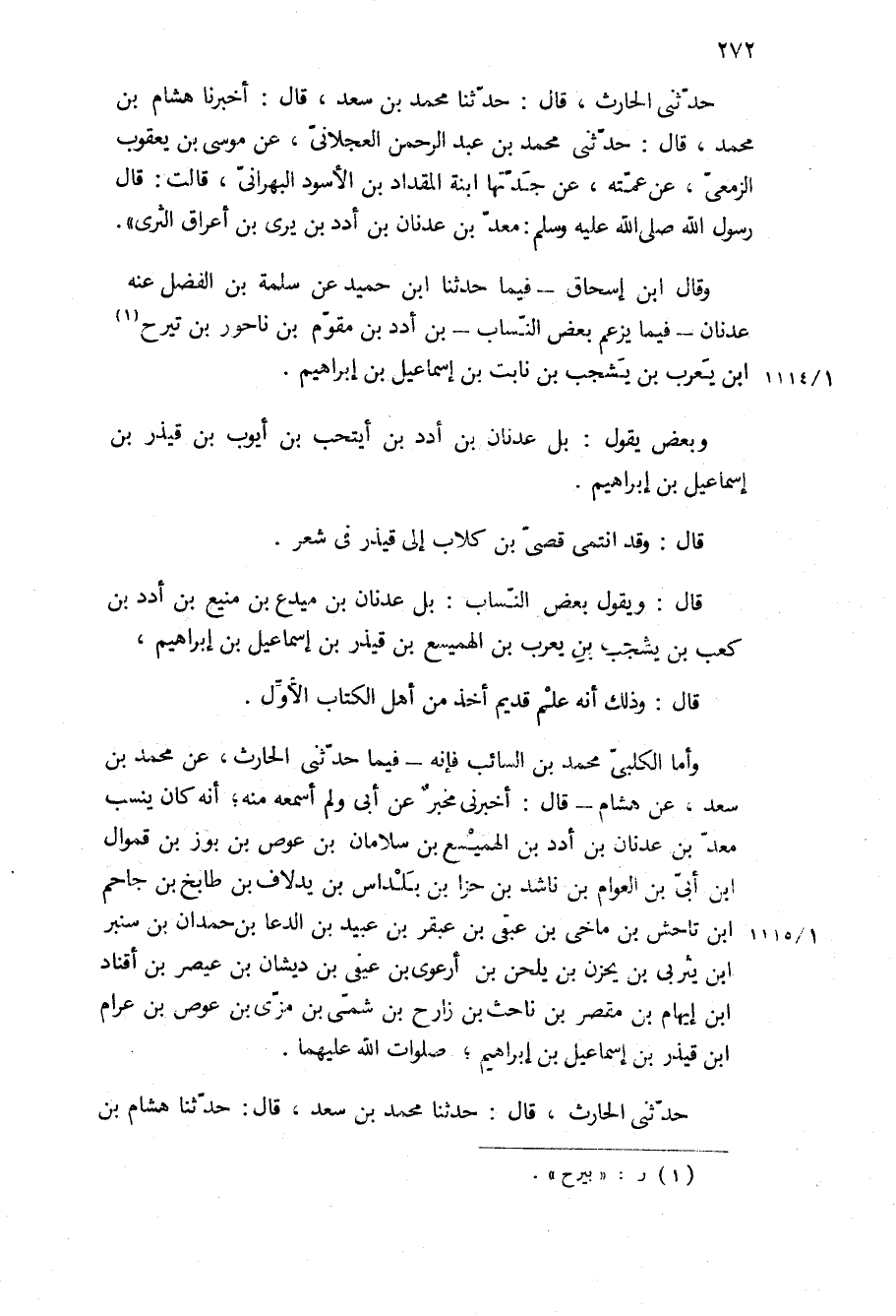 وَقَالَ ابْنُ إِسْحَاقَ- فِيمَا حَدَّثَنَا ابْنُ حُمَيْدٍ عن سلمة بن الفضل عنه عدنان- فيما يزعم بعض النساب- بن أدد بن مقوم بن ناحور بن تيرح ابن يعرب بن يشجب بن نابت بن إسماعيل بن إبراهيم.