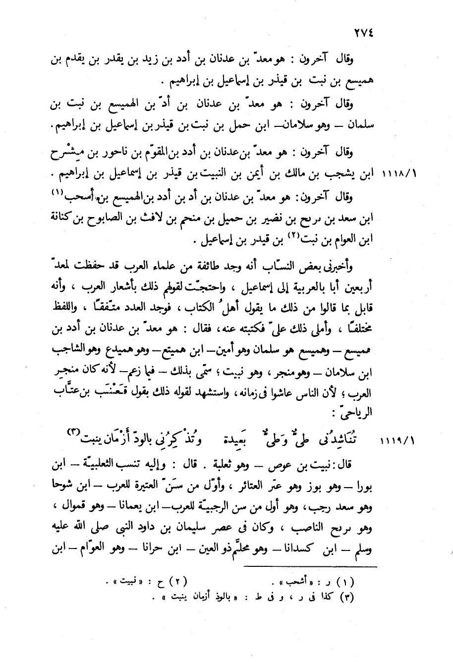 وأخبرني بعض النساب أنه وجد طائفة من علماء العرب قد حفظت لمعد أربعين أبا بالعربية إلى إسماعيل، واحتجت لقولهم ذلك بأشعار العرب، وأنه قابل بما قالوا من ذلك ما يقول أهل الكتاب، فوجد العدد متفقا، واللفظ مختلفا، وأملى ذلك علي فكتبته عنه، فقال: هو معد بن عدنان بن أدد بن هميسع- وهميسع هو سلمان وهو أمين- ابن هميتع- وهو هميدع وهو الشاجب ابن سلامان- وهو منجر، وهو نبيت سمي بذلك- فيما زعم- لأنه كان منجر العرب، لأن الناس عاشوا في زمانه، واستشهد لقوله ذلك بقول قعنب بن عتاب الرياحي: