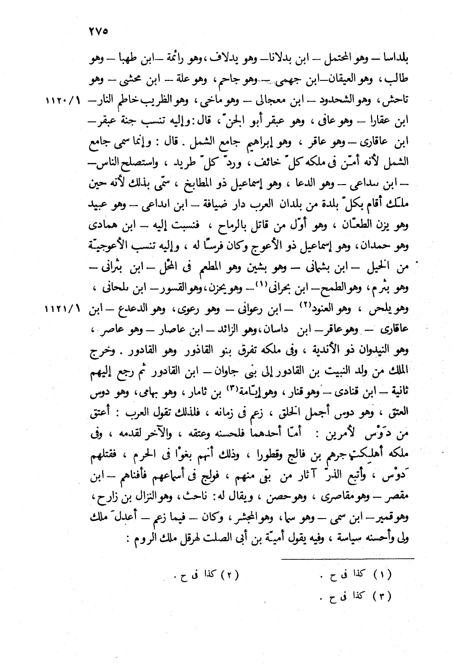 بلداسا- وهو المحتمل- ابن بدلانا- وهو يدلاف، وهو رائمه- ابن طهبا- وهو طالب، وهو العيقان- ابن جهمي- وهو جاحم، وهو علة- ابن محشي- وهو تاحش، وهو الشحدود- ابن معجالي- وهو ماخي، وهو الظريب خاطم النار- ابن عقارا- وهو عافي، وهو عبقر أبو الجن، قال: وإليه تنسب جنة عبقر- ابن عاقاري- وهو عاقر، وهو إبراهيم جامع الشمل قال: وإنما سمي جامع الشمل لأنه أمن في ملكه كل خائف، ورد كل طريد، واستصلح الناس-- ابن بيداعى- وهو الدعاء، وهو إسماعيل ذو المطابخ، سمي بذلك لأنه حين ملك أقام بكل بلدة من بلدان العرب دار ضيافة- ابن ابداعي- وهو عبيد وهو يزن الطعان، وهو أول من قاتل بالرماح، فنسبت إليه- ابن همادي وهو حمدان، وهو إسماعيل ذو الأعوج وكان فرسا له، وإليه تنسب الأعوجية من الخيل- ابن بشماني- وهو بشين وهو المطعم في المحل- ابن بثراني- وهو بثرم، وهو الطمح- ابن بحرانى- وهو يحزن، وهو القسور- ابن نلحانى، وهو يلحن، وهو العنود- ابن رعواني- وهو رعوي، وهو الدعدع- ابن عاقاري- وهو عاقر- ابن داسان، وهو الزائد- ابن عاصار- وهو عاصر، وهو النيدوان ذو الأندية، وفي ملكه تفرق بنو القاذور وهو القادور وخرج الملك من ولد النبيت بن القادور إلى بني جاوان- ابن القادور ثم رجع إليهم ثانية- ابن قنادي- وهو قنار، وهو إيامة بن ثامار، وهو بهامي، وهو دوس العتق، وهو دوس أجمل الخلق، زعم في زمانه، فلذلك تقول العرب: أعتق من دوس لأمرين: أما أحدهما فلحسنه وعتقه، والآخر لقدمه، وفي ملكه أهلكت جرهم بن فالج وقطورا، وذلك أنهم بغوا في الحرم، فقتلهم دوس، وأتبع الذر آثار من بقي منهم، فولج في أسماعهم فأفناهم- ابن مقصر- وهو مقاصري، وهو حصن، ويقال له: ناحث، وهو النزال بن زارح، وهو قمير- ابن سمي- وهو سما، وهو المجشر، وكان- فيما زعم- أعدل ملك ولي وأحسنه سياسة، وفيه يقول أمية بن أبي الصلت لهرقل ملك الروم: