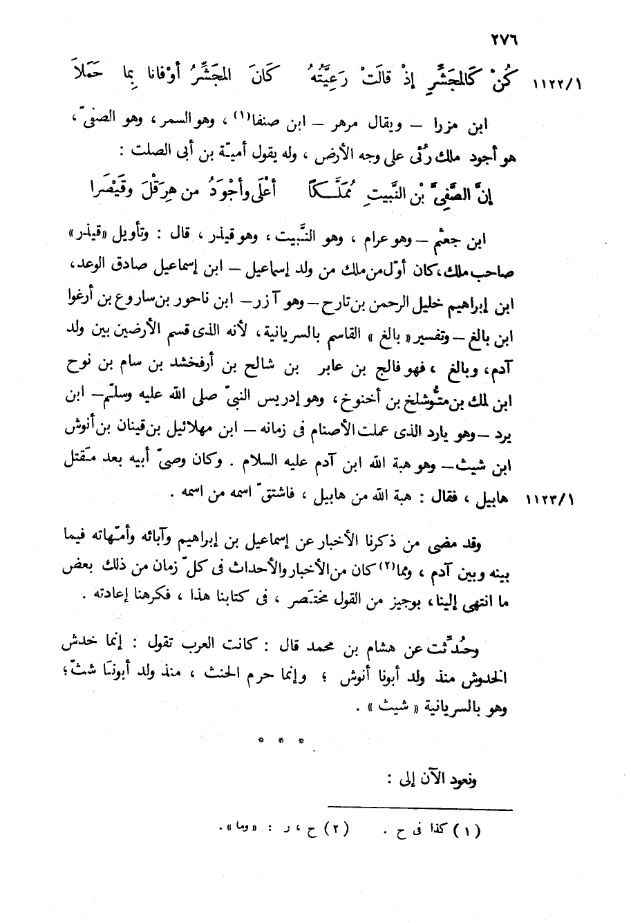 ابن جعثم- وهو عرام، وهو النبيت، وهو قيذر، قال: وتأويل قيذر صاحب ملك، كان أول من ملك من ولد إسماعيل- ابن إسماعيل صادق الوعد، ابن ابراهيم خليل الرحمن بن تارخ- وهو آزر- ابن ناحور بن ساروع بن ارغوا ابن بالغ- وتفسير بالغ القاسم بالسريانية، لأنه الذي قسم الأرضين بين ولد آدم، وبالغ، فهو فالج بن عابر بن شالح بن ارفخشد بن سام بن نوح ابن لمك بن متوشلخ بن أخنوخ، وهو إدريس النبي ص- ابن يرد- وهو يارد الذي عملت الأصنام في زمانه- ابن مهلائيل بن قينان بن انوش ابن شيث- وهو هبه الله ابن آدم ع وكان وصي أبيه بعد مقتل هابيل، فقال: هبة الله من هابيل، فاشتق اسمه من اسمه.