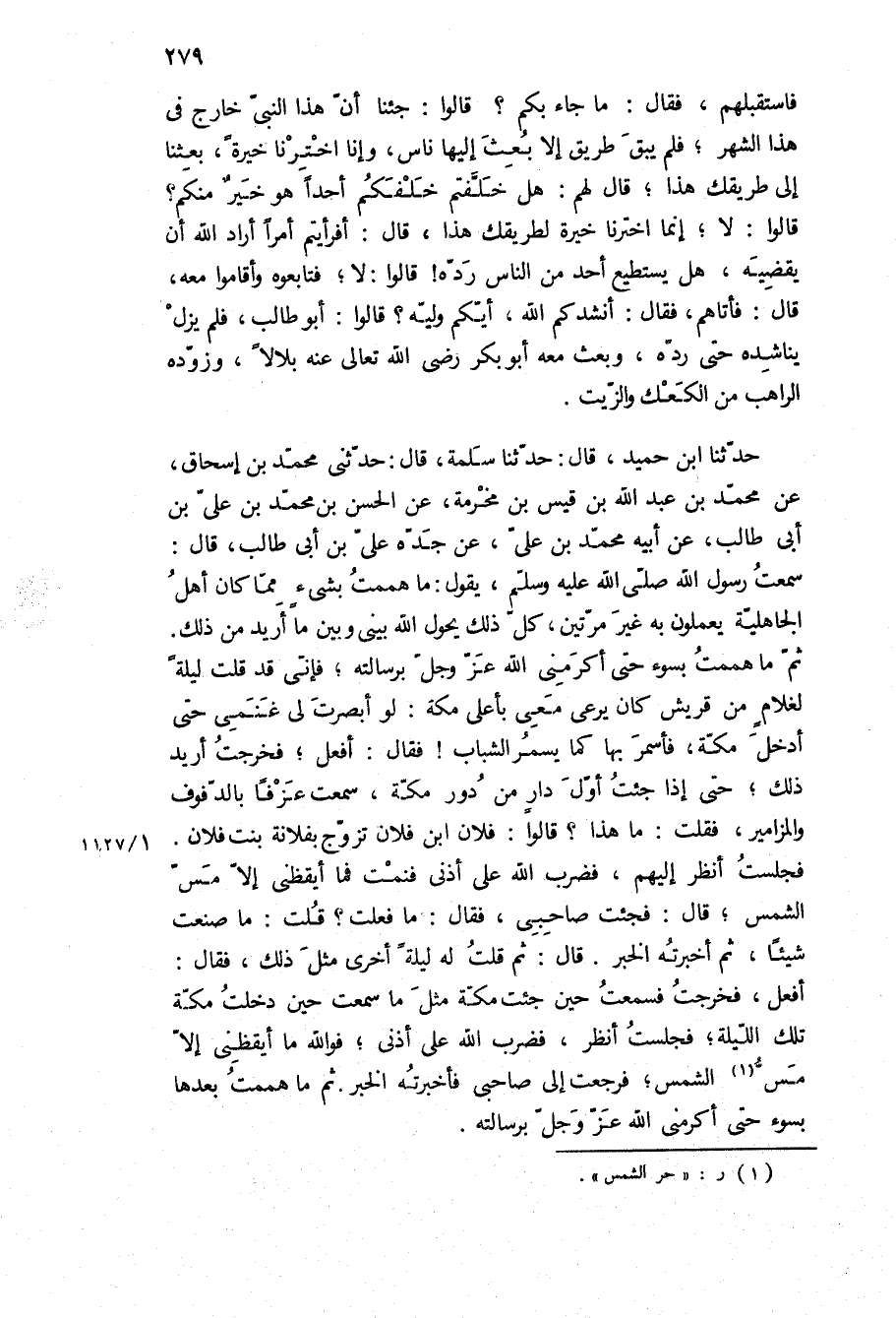 أَفْعَلُ، فَخَرَجْتُ فَسَمِعْتُ حِينَ جِئْتُ مَكَّةَ مِثْلَ مَا سَمِعْتُ حِينَ دَخَلْتُ مَكَّةَ تِلْكَ اللَّيْلَةَ، فَجَلَسْتُ أَنْظُرُ، فضرب الله على اذنى، فو الله مَا أَيْقَظَنِي إِلا مَسُّ الشَّمْسِ، فَرَجَعْتُ إِلَى صَاحِبِي فَأَخْبَرْتُهُ الْخَبَرَ، ثُمَّ مَا هَمَمْتُ بَعْدَهَا بِسُوءٍ حَتَّى أَكْرَمَنِي اللَّهُ عَزَّ وَجَلَّ بِرِسَالَتِهِ]