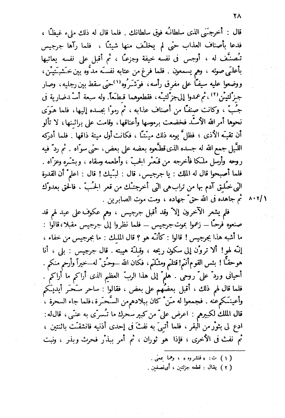 قَالَ: أخرجني الذي سلطانه فوق سلطانك فلما قَالَ له ذلك مليء غيظا، فدعا بأصناف العذاب حتى لم يخلف منها شيئا، فلما رآها جرجيس تصنف له، أوجس في نفسه خيفة وجزعا، ثم أقبل على نفسه يعاتبها بأعلى صوته، وهم يسمعون فلما فرغ من عتابه نفسه مدوه بين خشبتين، ووضعوا عليه سيفا على مفرق راسه، فوشروه حتى سقط بين رجليه، وصار جزلتين، ثم عمدوا إلى جزلتيه، فقطعوهما قطعا وله سبعة أسد ضارية في جب، وكانت صنفا من أصناف عذابه، ثم رموا بجسده إليها، فلما هوى نحوها أمر الله الأسد فخضعت برءوسها وأعناقها، وقامت على براثنها، لا تألو أن تقيه الأذى، فظل يومه ذلك ميتا، فكانت أول ميتة ذاقها فلما أدركه الليل جمع الله له جسده الذي قطعوه بعضه على بعض، حتى سواه ثم رد فيه روحه وأرسل ملكا فأخرجه من قعر الجب، وأطعمه وسقاه، وبشره وعزاه.