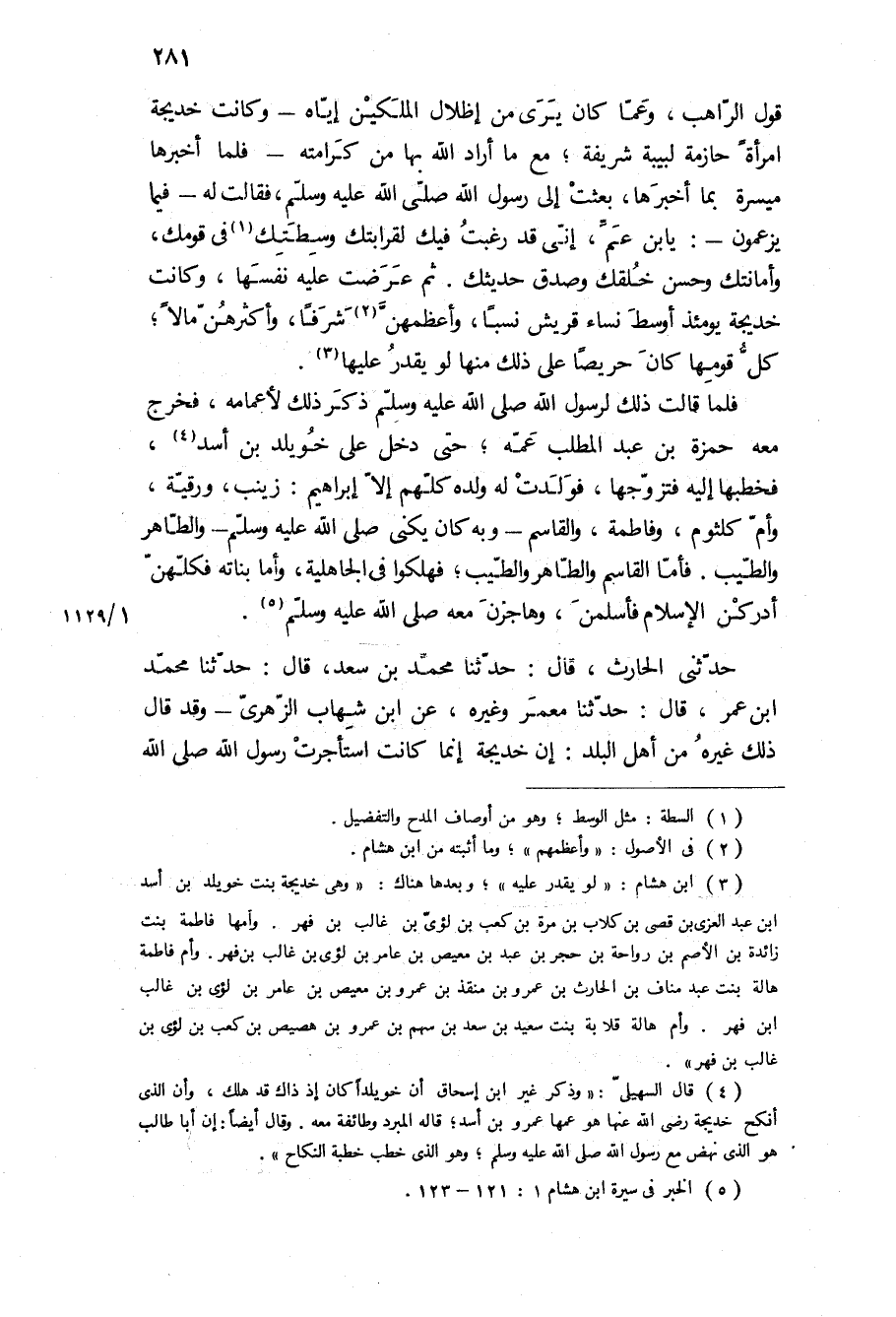 قَوْلِ الرَّاهِبِ، وَعَمَّا كَانَ يَرَى مِنْ إِظْلَالِ الْمَلَكَيْنِ إِيَّاهُ- وَكَانَتْ خَدِيجَةُ امْرَأَةً حَازِمَةً لَبِيبَةً شَرِيفَةً، مَعَ مَا أَرَادَ اللَّهُ بِهَا مِنْ كَرَامَتِهِ- فَلَمَّا أَخْبَرَهَا مَيْسَرَةُ بِمَا أَخْبَرَهَا، بَعَثَتْ الى رسول الله ص، فقالت له- فيما يزعمون-: يا بن عم، انى قد رغبت فيك لقرابتك وسطتك فِي قَوْمِكَ، وَأَمَانَتِكَ وَحُسْنِ خُلُقِكَ وَصِدْقِ حَدِيثِكَ ثُمَّ عَرَضَتْ عَلَيْهِ نَفْسَهَا، وَكَانَتْ خَدِيجَةُ يَوْمَئِذٍ أَوْسَطَ نِسَاءِ قُرَيْشٍ نَسَبًا، وَأَعْظَمَهُنَّ شَرَفًا، وَأَكْثَرَهُنَّ مَالًا، كُلُّ قَوْمِهَا كَانَ حَرِيصًا عَلَى ذَلِكَ مِنْهَا لَوْ يَقْدِرُ عَلَيْهَا.